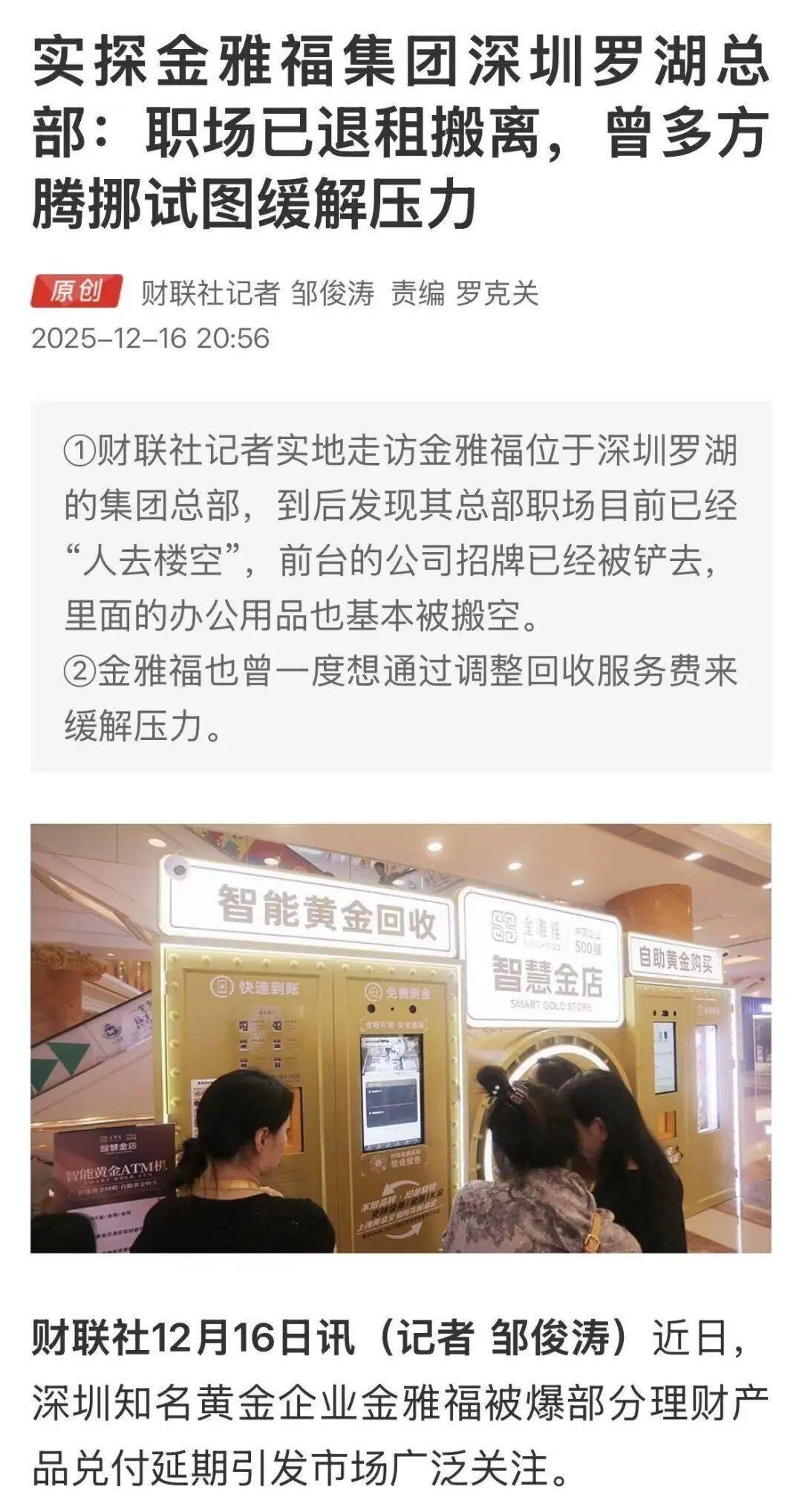 关注"保险八卦女", 由业界贼有良心的八卦姐打造。 重要提示: 后找不到美腻专业的八卦姐? 表急,这样做,我们就不会走散在茫茫人海了: 点击标题下面蓝色的"保险八卦女", ->点击右上角"..."->点选"★"。 大周末的,八卦姐正在潜心研究万科债券展期的事情,又被另一则消息吸引眼球: 这大过节的,真不让人省心。 先来看智通财经的报道: 那这次违的又是什么约? 这得从金雅福的投资模式说起: 据网上报道,从今年六七月份开始已有部分产品收益延迟,根据天眼查的信息,金雅福、深圳博耀等四家公司7月份被王某就"金融委托理财合同"告上法 庭: 深圳知名黄金企业金雅福被爆部分理财产品兑付延期引发市场广泛关注。 截至发文日,金雅福的理财产品已出现大规模延期,总部职场也"人去楼空"。 投资者从深圳金雅福控股集团有限公司(简称"金雅福")购买实物黄金; 同时与深圳市博耀创金担保投资有限公司(简称"深圳博耀")签订委托投资协议; 年化收益率约8%,到期后连本带息返还; 但实际上大多数投资者从未实际收到黄金。 根据每日经济新闻的消息,金雅福其实给出了一些解决方案,如债务展期、资金转股等,但投资者并不买账: 那么,这个金雅福究竟是何方 ...