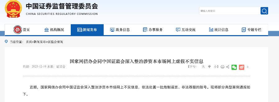 21世纪经济报道 记者 崔文静 根据证监会12月19日官网,近期,国家网信办会同中国证监会深入整治涉资本市场网上虚假不实信息,对涉资本市场网上虚假 不实信息进行系统性整治,依法处置一批炮制谣言、非法荐股的违规账号。此次行动直击资本市场信息乱象痛点,彰显监管部 门对网络空间秩序的坚定维护。 资本市场作为国民经济的"晴雨表",信息真实准确对市场健康运行至关重要。近期,部分自媒体账号为博取流量,肆意编造虚 假监管政策,恶意炒作上市公司负面信息,利用AI技术批量生成虚假内容,严重破坏资本市场信息生态。此类行为不仅扰乱投 资者判断,更可能引发市场波动,损害广大投资者合法权益。 此次专项整治行动聚焦五大类突出问题,对散布监管政策谣言、抹黑金融机构和上市公司、利用AI编造虚假信息、炒作股市走 势以及非法推荐股票等行为实施精准打击。微信公众号"八姐无敌""投行那些事儿"、新浪微博账号"投行小兵"、百度百家号"财 经周末老师"、抖音账号"爱在深秋—郑老师"等一批违规账号已被依法依约关闭。 随着监管力度持续加码,资本市场网络生态将得到显著净化,为投资者营造更加清朗的信息环境,也为资本市场高质量发展提 供坚实保障。这一行动不仅是对 ...