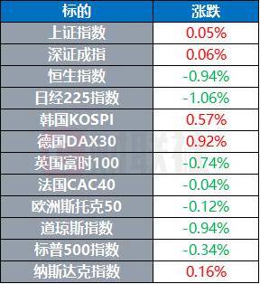 隔夜股市 | 标的 | 涨跌 | | --- | --- | | 上证指数 | 0.05% | | 深证成指 | 0.06% | | 恒生指数 | -0.94% | | 日经225指数 | -1.06% | | 韩国KOSPI | 0.57% | | 德国DAX30 | 0.92% | | 英国富时100 | -0.74% | | 法国CAC40 | -0.04% | | 欧洲斯托克50 | -0.12% | | 道琼斯指数 | -0.94% | | 标普500指数 | -0.34% | | 纳斯达克指数 | 0.16% | 美东时间周三,美股三大指数收盘涨跌不一,纳指涨0.16%,标普500指数跌0.34%,道指跌0.94%。 在消化一系列与特朗普相关的头条新闻之际,投资者也在关注最新美国经济数据:11月职位空缺降幅超 出预期,招聘活动有所放缓。本周五将公布至关重要的12月非农就业报告。 Longbow资产管理公司首席执行官Jake Dollarhide表示:"本周市场的核心就是非农就业报告,如果就业 数据走弱,可能会强化市场对美联储今年降息的预期。" 商品市场 | 标的 | 涨跌 | | --- | -- ...