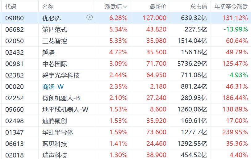12月30日,港股市场机器人概念股集体走强,其中,优必选涨超6%,第四范式、三花智控涨超5%,越疆涨近5%, 微创机器人涨超2%,地平线机器人-W、速腾聚创涨超1%。 | 代码 | 名称 | | 涨跌幅 √ | 最新价 | 总市值 | 年初至今涨跌 | | --- | --- | --- | --- | --- | --- | --- | | 09880 | 优必选 | 0 | 6.28% | 127.000 | 639.32 Z | 131.12% | | 06682 | 第四范式 | | 5.34% | 43.820 | 227.5亿 | -13.99% | | 02050 | 三花智控 | | 5.33% | 35.980 | 1514.04亿 | 60.64% | | 02432 | 成體 | | 4.72% | 35.500 | 156.18亿 | 49.79% | | 00981 | 中本国际 | | 3.09% | 71.700 | 5736.29 Z | 125.47% | | 02382 | 舜宇光学科技 | | 2.44% | 64.950 | 711.08 Z | -4.93% | | ...