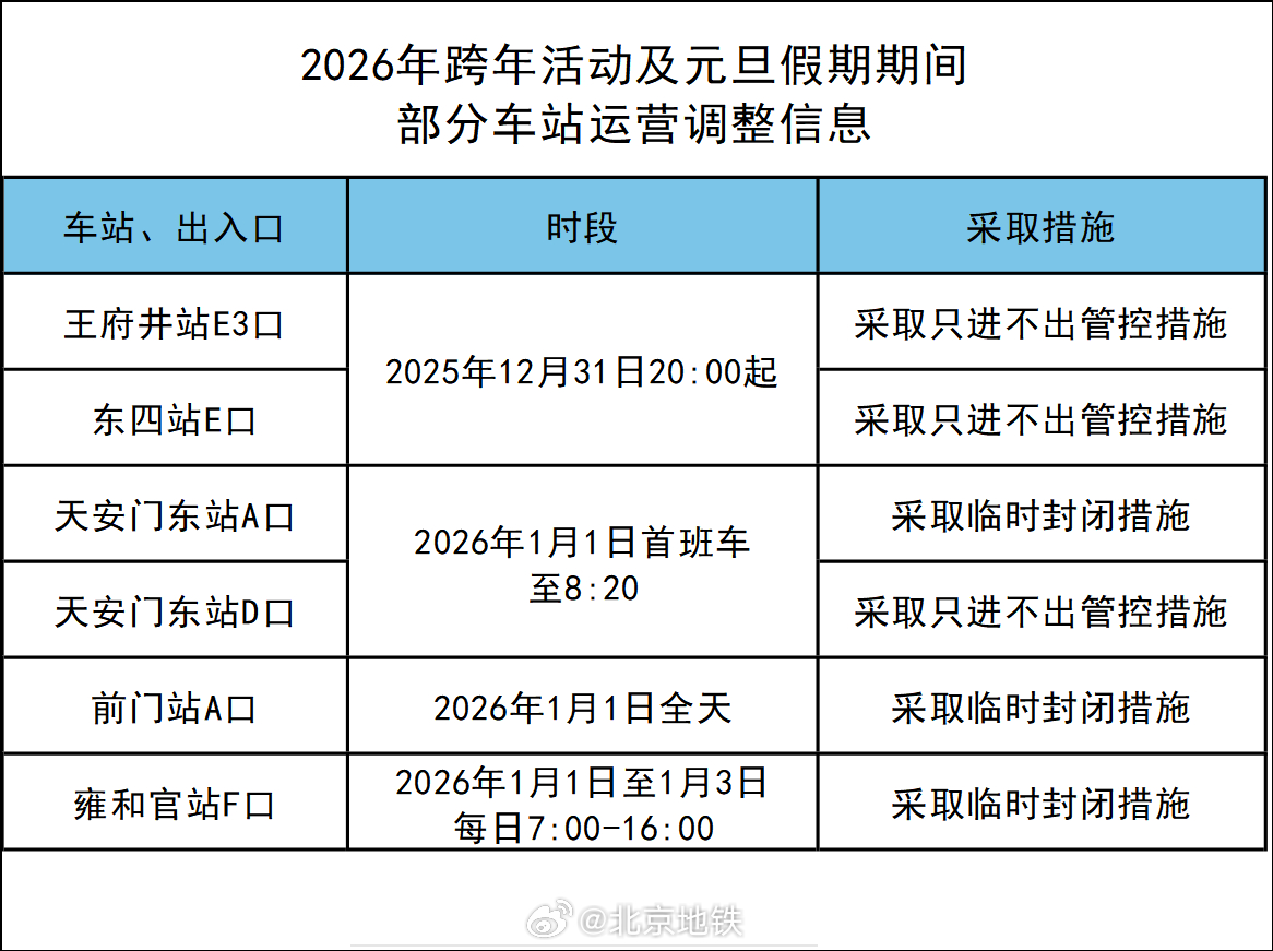 | 车站、出入口 | 时段 | 采取措施 | | --- | --- | --- | | 王府井站E3口 | 2025年12月31日20:00起 | 采取只进不出管控措; | | 东四站E口 | | 采取只进不出管控措; | | 天安门东站A口 | 2026年1月1日首班车 | 采取临时封闭措施 | | 天安门东站D口 | 至8:20 | 采取只进不出管控措; | | 前门站A口 | 2026年1月1日全天 | 采取临时封闭措施 | | 雍和官站F口 | 2026年1月1日至1月3日 每日7:00-16:00 | 采取临时封闭措施 | | 2026年跨年活动及元旦假期期间 | | --- | | 部分车站运营调整信息 | 为满足2026年跨年活动及元旦假期期间乘客出行需求,确保乘客平安、顺畅出行,北京地铁公司密切关注旅游景点、商圈等周边车站客流情况,对部分线路 车站采取"分时段"运营调整措施,请乘客提前安排出行计划。详情如下: 节日期间,部分线路车站将视客流情况,适时采取运营调整措施,同时加大运力投放,缓解客流压力。如遇临时调整,请乘客配合现场引导措施,注意出行 安全。如需帮助请及时联系现场工作人员或拨打地铁 ...