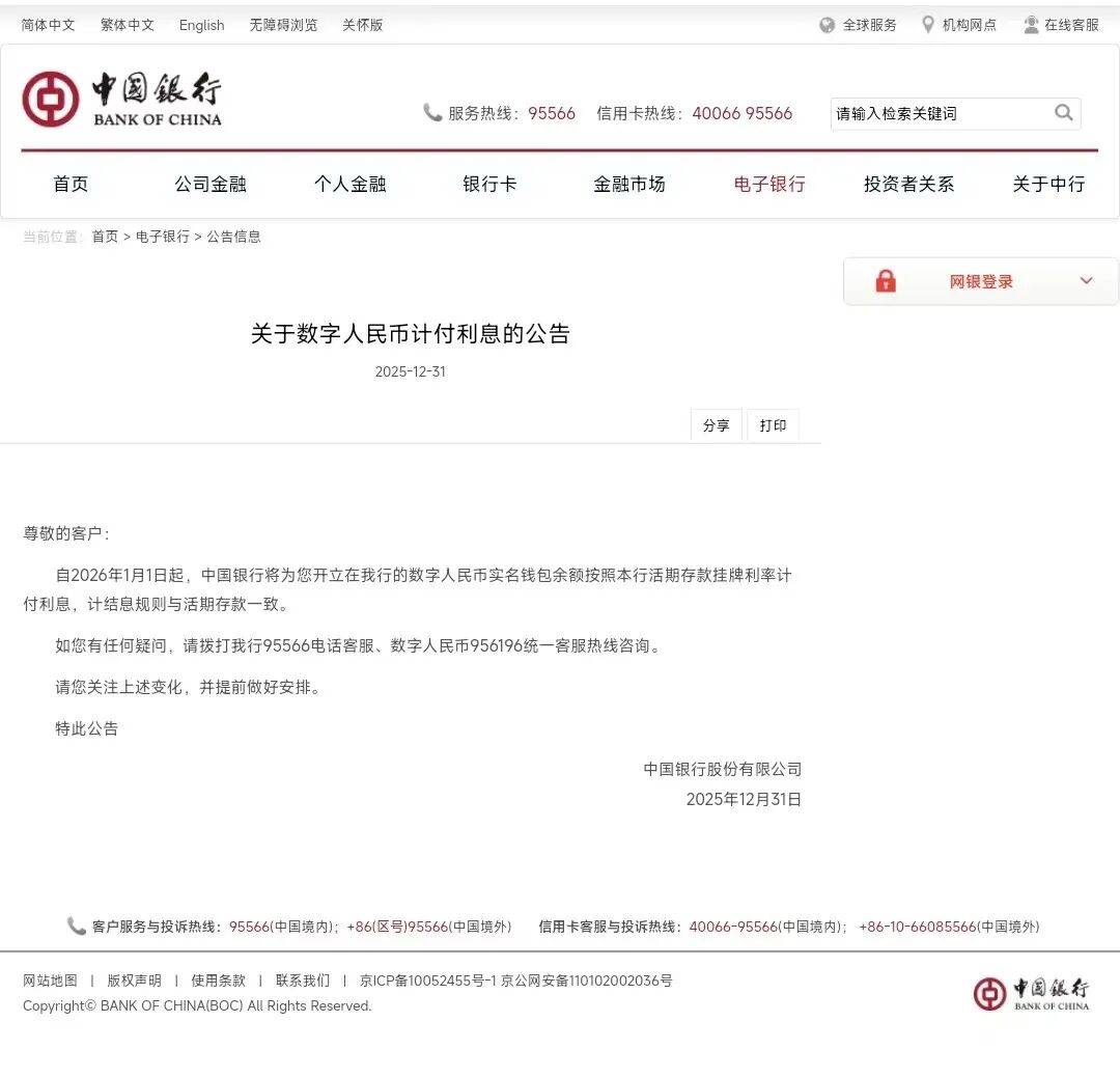 自2026年1月1日起,数字人民币实名钱包的余额将享有利息收益。 例如,工商银行称,2026年1月1日起,数字人民币实名钱包(一类、二类、三类钱包)中的钱包余额按照中国人民银行规定的活期存款结息规则计付利 息,并由钱包运营机构依法代扣代缴利息税(如有),钱包运营机构将为客户的钱包余额计付利息,按结息日我行挂牌活期利率计息,每季末月的20日结 息,21日入账。 工商银行提示,未到结息日清户时,按清户日挂牌公告的活期利率计息到清户前一日止;数字人民币钱包为匿名钱包(四类钱包),钱包内的余额不计付 利息。 从运营机构看,数字人民币的指定运营机构目前共有10家,包括6家国有大型商业银行、2家股份制商业银行和2家互联网银行,分别为工商银行、农业银 行、建设银行、中国银行、交通银行、邮储银行、招商银行、兴业银行、网商银行(支付宝)和微众银行(微信支付)。据悉央行正在推进运营机构扩容 工作。 近日央行出台《关于进一步加强数字人民币管理服务体系和相关金融基础设施建设的行动方案》,明确新一代数字人民币计量框架、管理体系、运行机制 和生态体系将于2026年1月1日正式启动实施。并同时明确,银行机构为客户实名数字人民币钱包余额计付 ...