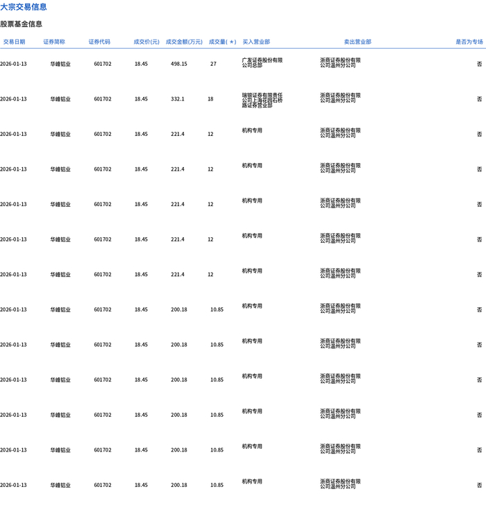 1月13日,华峰铝业大宗交易成交170.1万股,成交额3138.33万元,占当日总成交额的14.82%,成交价 18.45元,较市场收盘价19.42元折价4.99%。 | 交易日期 | 证券简称 | 证券代码 | | | 成交价(元) 成交金额(万元) 成交量(*) 买入营业部 | | 美出营业部 | 是否为专场 | | --- | --- | --- | --- | --- | --- | --- | --- | --- | | 2026-01-13 | 本峰铝亚 | 601702 | 18.45 | 498.15 | 27 | 心意度發展的有限 | 日常大学校 | 절 | | 2026-01-13 | 非储铝不 | 601702 | 18.45 | 332.1 | 18 | | 公司 2017年 10:50 | KI | | 2026-01-13 | 非峰居亚 | 601702 | 18.45 | 221.4 | 12 | 机构专用 | SHERE BE | Ka | | 2026-01-13 | 去酵层不 | 601702 | 18.45 | 221.4 | 12 | 机构专用 | SERVER | 1 ...