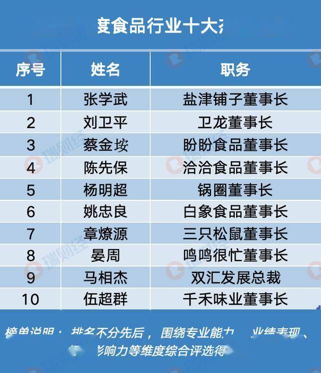 | 序号 | 姓名 | 职务 | | --- | --- | --- | | 1 | 张学武 | 盐津铺子董事长 | | 2 | 刘卫平 | 卫龙董事长 | | 3 | 蔡金按 | 盼盼食品董事长 | | 4 | 陈先保 | 洽洽食品董事长 | | 5 | 杨明超 | 锅圈董事长 | | 6 | 姚忠良 | 白象食品董事长 | | 7 | 章燎源 | 三只松鼠董事长 | | 8 3111 | 물 팀 | 鸣鸣很忙董事长 | | 9 | 马相杰 | 双汇发展总裁 | | 10 | 伍超群 | 千禾味业董事长 | | | 碎的治阳· #全不分先后,围绕专业能力 业绩表现、 | | | | g 影响力等维度综合评选得 | | 瑞财经 1月13日,由瑞财经推出的"2025年度食品行业十大杰出人物"榜单揭晓,锅圈董事长杨明超入 选。 "2025年度食品行业十大杰出人物"榜单围绕专业能力、业绩表现、行业影响力等维度综合评选得出。 杨明超从解决自家做饭难题出发,把锅圈做成覆盖全国的万店品牌,实现门店扩张与数字化创新双线突 破。 杨明超,1970年出生,为锅圈的创始人、董事长、执行董事、董事会提名委员会主席兼首席执行官。杨 ...