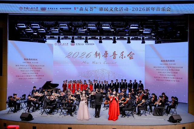 本场音乐会阵容强大,集结了中国人民大学艺术学院、学生艺术团、校友合唱团、附中管弦乐团、附小 弦乐团等高水平艺术团体。同时,还联动武汉音乐学院、中央民族大学音乐学院、中国音乐学院管弦系 等高校资源,形成多层次、广覆盖的演出矩阵。 转自:北京日报客户端 12月21日,由中国人民大学与首都图书馆联合主办的"2026新年音乐会"在北京城市图书馆智和厅举行。 作为首都图书馆"森友荟"惠民文化活动献给市民的新年文化厚礼,本次音乐会以中国人民大学深厚的艺 术教育底蕴为内容支撑,以首都图书馆成熟的公共文化服务体系作为服务保障,汇聚多元优质资源,为 观众奉上一场兼具思想性与艺术性的高品质视听盛宴。此次活动不仅推动北京优质艺术资源向城市副中 心有效集聚,更以音乐为桥梁,传递出辞旧迎新的美好祝愿,成为文化创新赋能区域高质量发展的生动 注脚。 音乐会以"传统的当代回声"为主线,精选多首兼具民族情怀与现代审美的作品。《丝竹的交响》以江苏 民歌为魂,勾勒江南水乡的诗意画卷;朝鲜族民谣《翁嘿呀》与《阿里郎》相继登场,为音乐会增添了 浓郁的民族风情。从内蒙古民歌《鸿雁》承载的悠远乡愁,到小提琴协奏曲《梁祝·化蝶》演绎的经典 浪漫,再到全体演 ...