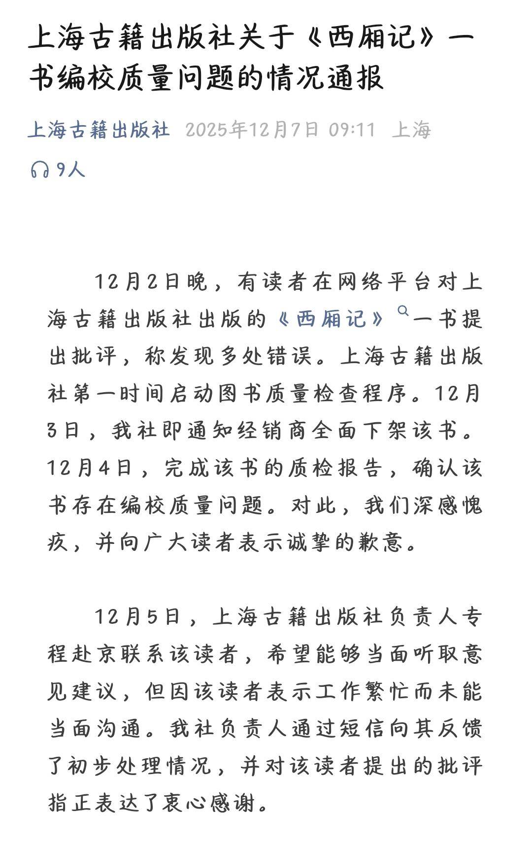 上海古籍出版社关于《西厢记》 书编校质量问题的情况通报 上海古籍出版社 2025年12月7日 09:11 上海 6 9人 12月2日晚,有读者在网络平台对上 海古籍出版社出版的《西厢记》 一书提 出批评,称发现多处错误。上海古籍出版 社第一时间启动图书质量检查程序。12月 3日,我社即通知经销商全面下架该书。 12月4日,完成该书的质检报告,确认该 书存在编校质量问题。对此,我们深感愧 疚,并向广大读者表示诚挚的歉意。 12月5日,上海古籍出版社负责人专 程赴京联系该读者,希望能够当面听取意 见建议,但因该读者表示工作繁忙而未能 当面沟通。我社负责人通过短信向其反馈 了初步外理情况、并对该读者提出的批评 据悉,12月6日,上海古籍出版社召开图书质量工作专题会议,就《西厢记》一书中暴露出的内部管理问题和质量把关问题,进行深刻反思并研究整改措 施;要求全社上下吸取教训、举一反三,强调要始终把编校质量作为出版社的生命线。"上海古籍出版社热忱欢迎广大读者对图书质量进行监督,我社将 虚心听取各方面意见建议,全力保障读者权益,不断改进自身工作,不辜负广大读者对我们的信任与厚爱。" 此前,博主"北大一五老师"发文表示"上海 ...