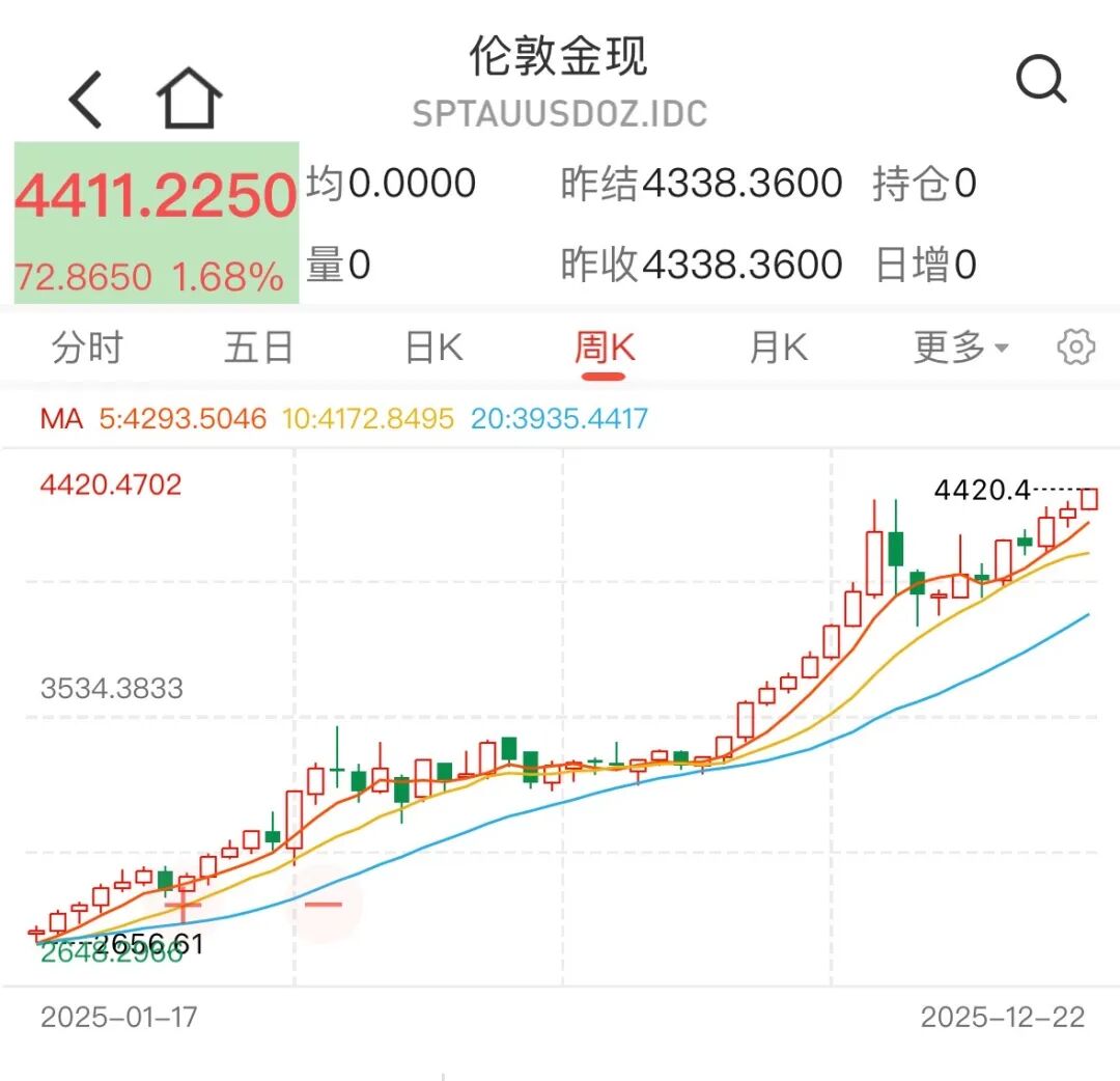 2025年的牛市是贵金属的,黄金、白银双双创出历史新高。其中,白银的涨幅居首,年内涨幅逼近140%,黄金上涨67%。显然贵金属的亮眼表现,让大 多数机构始料未及,不少大机构连夜为研报"打补丁",不过仍然赶不上金银的上涨趋势,金银成投资界"最靓的仔" 黄金年内47次创历史新高 现货黄金今年先后47次创历史新高。12月22日,突破10月20日的高点,4381.11美元/盎司,再创历史新高,盘中最高触及4409.17美元/盎司,年内涨幅超 过67%,也是黄金历史上首次突破4400美元/盎司(截至北京时间14:20分,下同)。 (截至北京时间2025年12月22日18:55,伦敦金现报4411.23美元/盎司) 黄金已经连续三年熠熠生辉。自2023年,黄金以1826.51美元/盎司开盘,随后展开了这一波波澜壮阔的牛市,三年累计涨幅高达138%,成为全资产池"最 靓的仔"。 现货涨不停,黄金股的股价也跟着水涨船高,如紫金矿业(601899)今日盘中触及32.78元,刷新了历史纪录。 过快过高的涨幅,也提升了投资人的起投门槛。最近三年,不少银行多次上调了积存金的起投门槛,有些甚至直接喊停。如光大银行此前发文称,自10月 ...