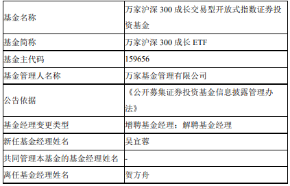 万家中证全指公用事业ETF成立于2024年9月11日,截至2025年9月29日,其今年来收益率 为-0.59%,成立来收益率为-6.82%,累计净值为0.9318元。 | 基金名称 | 万家沪深 300 成长交易型开放式指数证券投 | | --- | --- | | | 资基金 | | 基金简称 | 万家沪深 300 成长 ETF | | 基金主代码 | 159656 | | 基金管理人名称 | 万家基金管理有限公司 | | 公告依据 | 《公开募集证券投资基金信息披露管理办 法》 | | 基金经理变更类型 | 增聘基金经理:解聘基金经理 | | 新任基金经理姓名 | 吴宜蓉 | | 共同管理本基金的基金经理姓名 | | | 离任基金经理姓名 | 贺方舟 | | 基金名称 | 万家创业板综合交易型开放式指数证券投资 | | --- | --- | | | 基金 | | 基金简称 | 万家创业板综合 ETF | | 基金主代码 | 159541 | | 基金管理人名称 | 万家基金管理有限公司 | | 公告依据 | 《公开募集证券投资基金信息披露管理办法》 | | 基金经理变更类型 | 增聘基金经理:解聘基金经 ...
