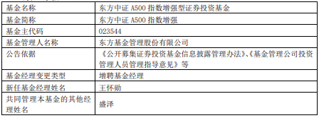 中国经济网北京9月16日讯今日,东方基金公告,东方中证A500指数增强、东方沪深300指数增强增聘 王怀勋。 | 基金名称 | 东方中证 A500 指数增强型证券投资基金 | | --- | --- | | 基金简称 | 东方中证 A500 指数增强 | | 基金主代码 | 023544 | | 基金管理人名称 | 东方基金管理股份有限公司 | | 公告依据 | 《公开募集证券投资基金信息披露管理办法》、《基金管理公司投资 | | | 管理人员管理指导意见》等 | | 基金经理变更类型 | 增聘基金经理 | | 新任基金经理姓名 | 王怀勋 | | 共同管理本基金的其他经 | 盛泽 | | 理姓名 | | 王怀勋曾任中国人寿保险股份有限公司研发人员。2015年加盟东方基金,曾任产品开发部产品经理助 理、专户投资部产品经理、量化投资部研究员,基金经理助理、基金经理。 | 基金名称 | 东方沪深 300 指数增强型证券投资基金 | | --- | --- | | 基金简称 | 东方沪深 300 指数增强 | | 基金主代码 | 016204 | | 基金管理人名称 | 东方基金管理股份有限公司 | | 公告依据 ...