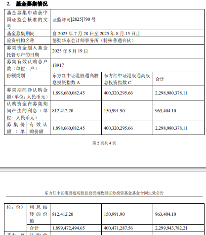 基金产品信息 - 东方红中证港股通高股息投资指数型证券投资基金正式成立 募集期间净认购金额达22.99亿元人民币[1] - 基金分为A类和C类份额 A类净认购18.99亿元人民币 C类净认购4.00亿元人民币[2] - 总募集份额为22.99亿份 其中A类份额18.99亿份 C类份额4.00亿份[2][4] 募集细节 - 募集期间产生利息收入96.34万元人民币 全部转为基金份额[1][2] - 募集有效认购总户数为18,917户[2] - 募集期为2025年7月28日至2025年8月15日 资金于2025年8月19日划入托管专户[2] 基金管理团队 - 基金经理徐习佳现任公募指数与多策略部总经理 曾任兴业全球基金金融工程与专题研究部副总监和量化投资部总经理[1] - 基金经理戎逸洲历任量化投资部研究员和公募指数与多策略部高级研究员[1] - 验资机构为德勤华永会计师事务所(特殊普通合伙)[2] 监管核准 - 基金募集申请获中国证监会核准 核准文号为证监许可[2025]790号[2]