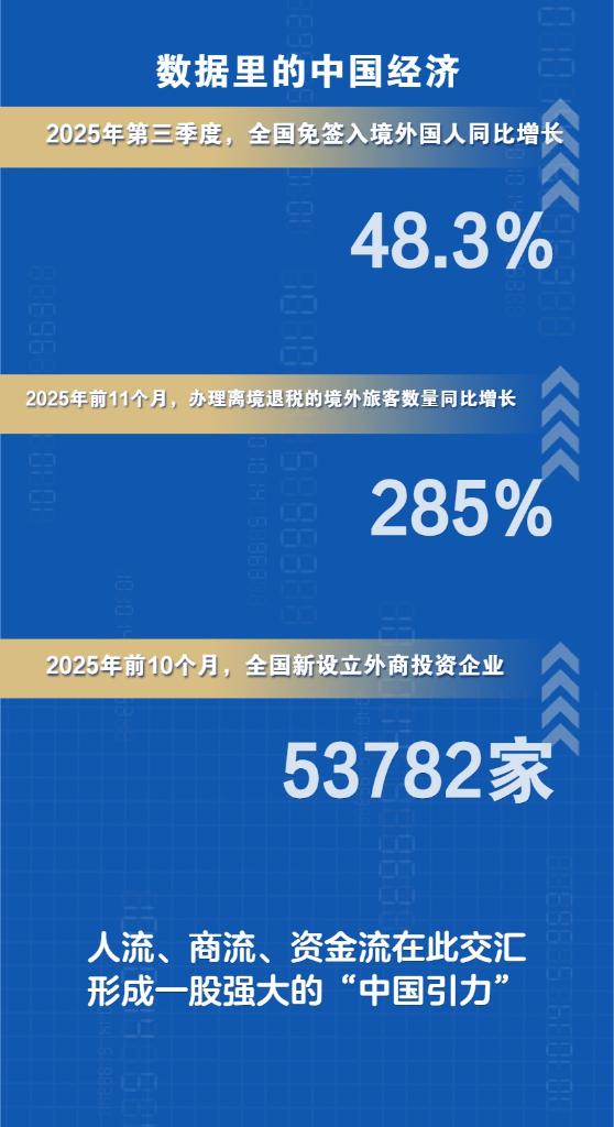 新华社上海12月26日电(记者王默玲、周蕊、桑彤)免签政策持续扩容,"中国游"热潮席卷全球;离境退税便捷高效,"中国购"热度持续攀 升;外资企业加速布局,"投资中国"信心坚定。2025年,人流、商流、资金流在此交汇,形成一股强大的"中国引力"。 "中国游"旺 夜晚的黄浦江畔,美国游客莱娜正举着手机视频通话,兴奋地向家人展示上海外滩的风光。一边是陆家嘴灯光璀璨的都市天际线,一边是外 滩别具风情的万国建筑群。"上海太迷人了!"莱娜告诉记者,"过境免签政策让我来了一次说走就走的中国游,这是我2025年做的最正确的决 定。" 作为国际消费中心城市,上海的"中国购"热度尤为凸显。记者从国家税务总局上海市税务局获悉,2025年1月至11月,上海办理离境退税的境 外旅客数量同比增长156.3%,退税商品销售额和退税额同比增长约80%。 这样的消费热度绝非上海独有。2025年截至11月底,广东省内海关共验核离境退税申请单9.3万票,离境退税商品金额17.5亿元,分别是去年 同期的7.5倍和2倍,实现大幅增长;深圳市2025年前11个月办理离境退税5.6万笔,同比增长13倍,离境退税商品退税销售额同比增长2.4倍,"即 买即退 ...
