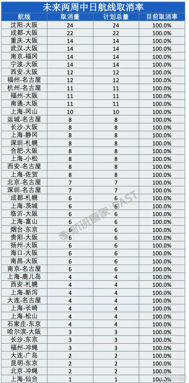 (来源:海胆新闻) (来源:海胆新闻) 12月22日至1月4日,46条中日航线将取消全部航班。截至2025年12月22日,2026年1月中国大陆赴日航 班取消量已达2195班次,航班取消率为40.4%。 | | | 未来两周中日航线取消率 | | | --- | --- | --- | --- | | 航线 | 取消量 | 计划总量 | 目前取消率 | | 沈阳-大阪 | 24 | 24 | 100.0% | | 成都-大阪 | 22 | 22 | 100.0% | | 重庆-大阪 | 14 | 14 | 100.0% | | 武汉-大阪 | 14 | 14 | 100.0% | | 南京-福冈 | 14 | 14 | 100.0% | | 宁波-大阪 | 14 | 14 | 100.0% | | 西安-大阪 | 12 | 12 | 100.0% | | 福州-名古屋 | 12 | 12 | 100.0% | | 杭州-名古屋 | 11 | 11 | 100.0% | | 福州-大阪 | 11 | 11 | 100.0% | | 南通-大阪 | JI | 11 | 100.0% | | 上海-冈山 | 10 ...
