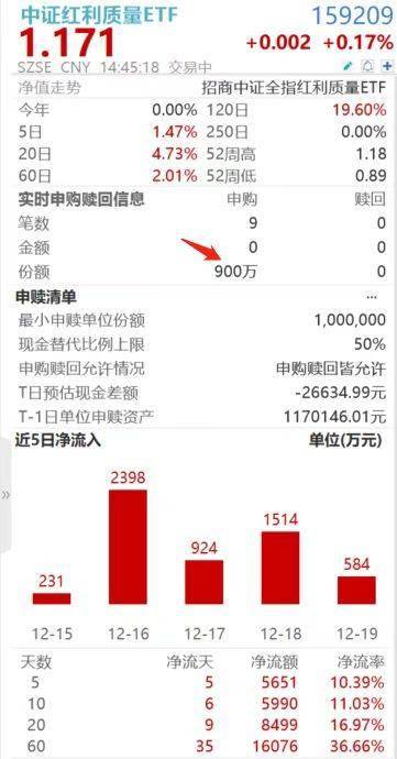 | 证红利质量ETF | | | 159209 | | --- | --- | --- | --- | | | | | +0.002 +0.17% | | SZSE CNY 14:45:18 交易中 | | | 10+ | | 净值走势 | | 招商中证全指红利质量ETF | | | 交在 | 0.00% 120日 | | 19.60% | | 5日 | 1.47% 250日 | | 0.00% | | 20日 | 4.73% 52周高 | | 1.18 | | 60日 | 2.01% 52周低 | | 0.89 | | 实时申购赎回信息 | 申购 | | 赎回 | | 笔数 | | ਰੇ | 0 | | 金额 | | 0 | 0 | | 份额 | 900万 | | 0 | | 申陵清单 | | | | | 最小申赎单位份额 | | | 1,000,000 | | 现金替代比例上限 | | | 50% | | 申购赎回允许情况 | | | 申购赎回皆允许 | | T日预估现金差额 | | | -26634.99元 | | T-1日单位申赎资产 | | | 1170146.01元 | | 近5日净流入 | | ...