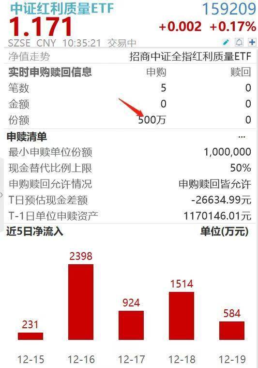 | 中证红利质量ETF | | | 159209 | | --- | --- | --- | --- | | | | +0.002 +0.17% | | | SZSE CNY 10:35:21 交易中 | | COH | | | 净值走势 | | 招商中证全指红利质量ETF | | | 实时申购赎回信息 | | 申购 赎回 | | | 笔数 | | 5 0 | | | 金额 | | 0 0 | | | 份额 | 500万 | 0 | | | 印ច精度 | | | | | 最小申赎单位份额 | | 1,000,000 | | | 现金替代比例上限 | | 50% | | | 申购赎回允许情况 | | 申购赎回皆允许 | | | T日预估现金差额 | | -26634.99元 | | | T-1日单位申赎资产 | | 1170146.01元 | | | 近5日净流入 | | 单位(万元) | | | 2398 | | | | | | | 1514 | | | 924 | | 584 | | | 231 | | | | | 12-15 12-16 | 12-17 | 12-18 12-19 | | 12月22日,数 ...