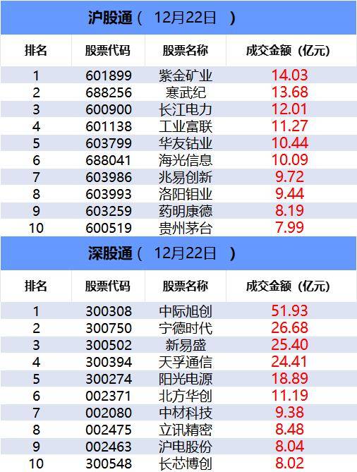 沪深股通今日合计成交1821.61亿,其中紫金矿业和中际旭创分居沪股通和深股通个股成交额首位。板 块主力资金方面,通信板块主力资金净流入居首。ETF成交方面,中证A500指数ETF(563880)成交额 环比增长309%。此外,银行ETF(512800)近三周共计减少51亿份。 龙虎榜方面,商业航天概念今日持续活跃,天银机电获两家机构买入6544万,遭三家机构卖出6487万, 一家实力游资(国泰海通证券成都北一环路)卖出7062万;通宇通讯获一家实力游资(中国银河证券大 连黄河路)买入9021万,却遭两家机构卖出1.2亿。 一、沪深股通前十大成交 今日沪股通总成交金额为810.44亿,深股通总成交金额为1011.17亿。 | | | 沪股通( 12月22日 ) | | | --- | --- | --- | --- | | 排名 | 股票代码 | 股票名称 | 成交金额(亿元) | | 1 | 668109 | 紫雯郎,亦 | 14.03 | | 2 | 688256 | 其武纪 | 13.68 | | 3 | 600900 | 长江电力 | 12.01 | | 4 | 601138 | 工业富联 | 11. ...
