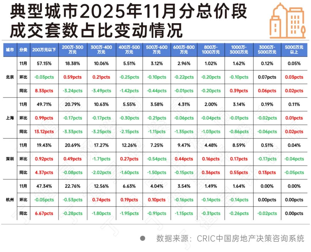 刚刚过去的住建部工作会议强调:"要充分认识二手房交易占比上升是今后一个时期的趋势,把新房市场和二手房市场作为一个整体来看待。" 数据显示,2025年11月,30个重点城市二手房成交面积1704万平方米,环比上涨14%。受二手房带动,11月一二手总成交面积2453万平方米,环比微增 1%。 近年来,各地豪宅纷纷出圈,豪宅市场也成为了市场主要关注焦点,但从二手房整体成交占比来看,即使是北京、上海,总价200万以下成交才是主流。 200万以下房源 成交占比同比增长显著 2025年下半年起,因二手房市场行情低迷、业主"以价换量",成交结构中低价房源占比持增。 CRIC监测数据显示,2025年11月,北京、上海、深圳、杭州等总价200万元以下房源成交占比同比增长显著,其中上海和深圳总价200万元以下房源成交 套数占比同环比齐增。 以上海为例,2025年11月总价200万元以内房源成交套数占比为49.71%,环比上升0.99pcts,同比上升13.12pcts;市场份额有进一步扩大趋势。 与此同时,上海、北京总价300万-1000万元二手需求全面"塌陷",同环比全线"飘绿",一方面受整体市场压力影响;另一方面,也源于新房 ...