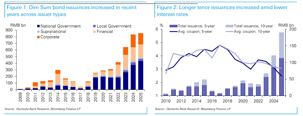 核心观点 - 人民币点心债市场正从一个边缘化的“小众市场”演变为具有重要配置价值的“主流资产”,历史性的发展机遇窗口已经打开 [1] - 市场正进入“发行扩大-流动性增强-吸引更多投资者-鼓励更多发行”的良性循环,应被视为全球资产配置中愈发重要的组成部分 [1] 市场规模与发行主体扩张 - 年度发行量从2021年的3000亿元人民币激增至2024年的8500亿元人民币,预计2025年将达到9000亿至1万亿元人民币 [2] - 市场存量规模已达1.8万亿元人民币 [2] - 发行人基础从中国走向国际,中国科技公司(如阿里巴巴、百度、腾讯)及外国主体(如哈萨克斯坦开发银行、印度尼西亚政府)完成首次发行 [2] - 15至30年期超长期债券发行量从2020-23年间几乎为零,增长到2024年的110亿元人民币,并在2025年至今达到200亿元人民币 [2] 市场需求与资金基础质变 - 当前离岸人民币资金池的增长主要源于真实的跨境贸易和资本结算需求,而非投机 [4] - 人民币在经常账户支付中的结算份额从2021年的18%增至2025年上半年的28% [4] - 2025年第三季度,贸易及经常项目下的人民币结算量达到4.76万亿元人民币,是2014年同期的三倍 [4] - “南向债券通”自2022年启动以来,已允许内地银行直接投资点心债,迄今累计规模达到6000亿元人民币 [8] 政策支持与市场机制 - 中国“十五五”规划对人民币国际化的政策基调从“稳慎推进”转变为“推进” [8] - 中国人民银行承诺定期在海外发行国债和央行票据以完善收益率曲线、支持更多合格主体赴港发债、通过货币互换增加长期人民币流动性供给 [8] - “南向债券通”下一步将资格扩大到保险公司、资产管理公司等非银行金融机构,以提升市场需求和流动性 [8] 宏观环境与全球吸引力 - 亚洲国际债券发行中,美元计价的份额已从2020年的83%降至2024年的67%,而人民币计价的份额则迅速增长至11% [11] - 人民币已进入升值通道,2025年至今兑美元已升值约4%,并有望在2026-27年继续走强 [11] - 在全球寻求美元替代资产的大背景下,叠加人民币升值预期,点心债对全球投资者的吸引力显著增强 [6]