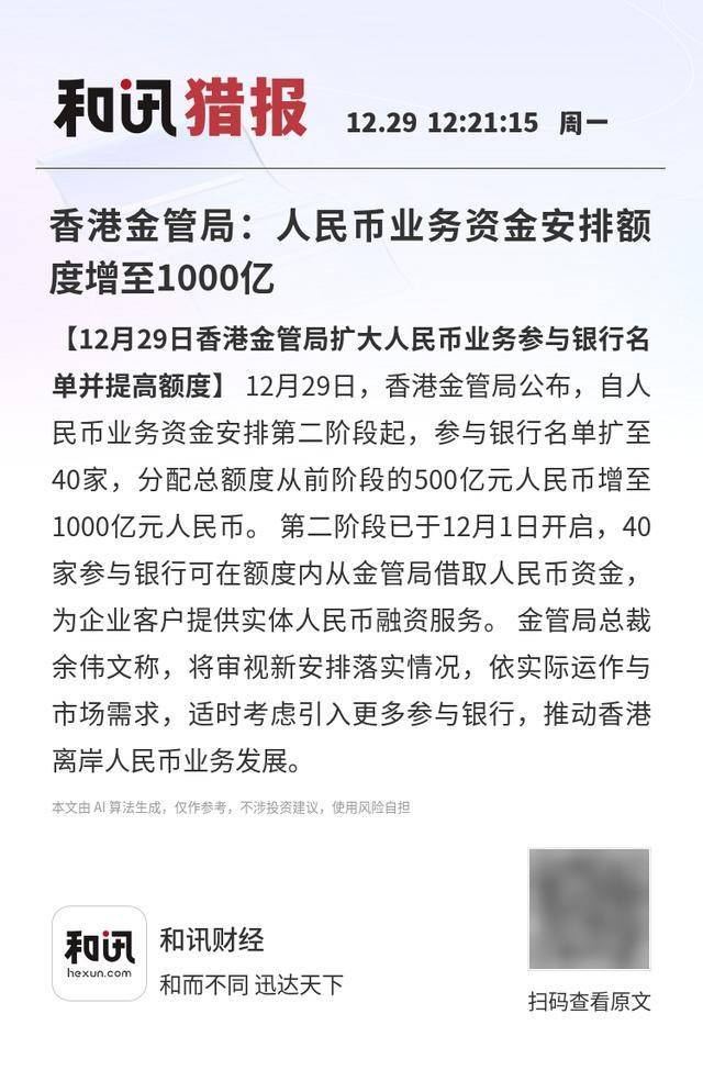 【12月29日香港金管局扩大人民币业务参与银行名单并提高额度】12月29日,香港金管局公布,自人民 币业务资金安排第二阶段起,参与银行名单扩至40家,分配总额度从前阶段的500亿元人民币增至1000 亿元人民币。 第二阶段已于12月1日开启,40家参与银行可在额度内从金管局借取人民币资金,为企业 客户提供实体人民币融资服务。 金管局总裁余伟文称,将审视新安排落实情况,依实际运作与市场需 求,适时考虑引入更多参与银行,推动香港离岸人民币业务发展。 本文由 AI 算法生成,仅作参考,不涉投资建议,使用风险自担 扫码查看原文 和讯猎报 12.29 12:21:15 周一 香港金管局:人民币业务资金安排额 度增至1000亿 【12月29日香港金管局扩大人民币业务参与银行名 单并提高额度】 12月29日,香港金管局公布,自人 民币业务资金安排第二阶段起,参与银行名单扩至 40家,分配总额度从前阶段的500亿元人民币增至 1000亿元人民币。第二阶段已于12月1日开启,40 家参与银行可在额度内从金管局借取人民币资金, 为企业客户提供实体人民币融资服务。 金管局总裁 余伟文称,将审视新安排落实情况,依实际运作与 市场需求 ...