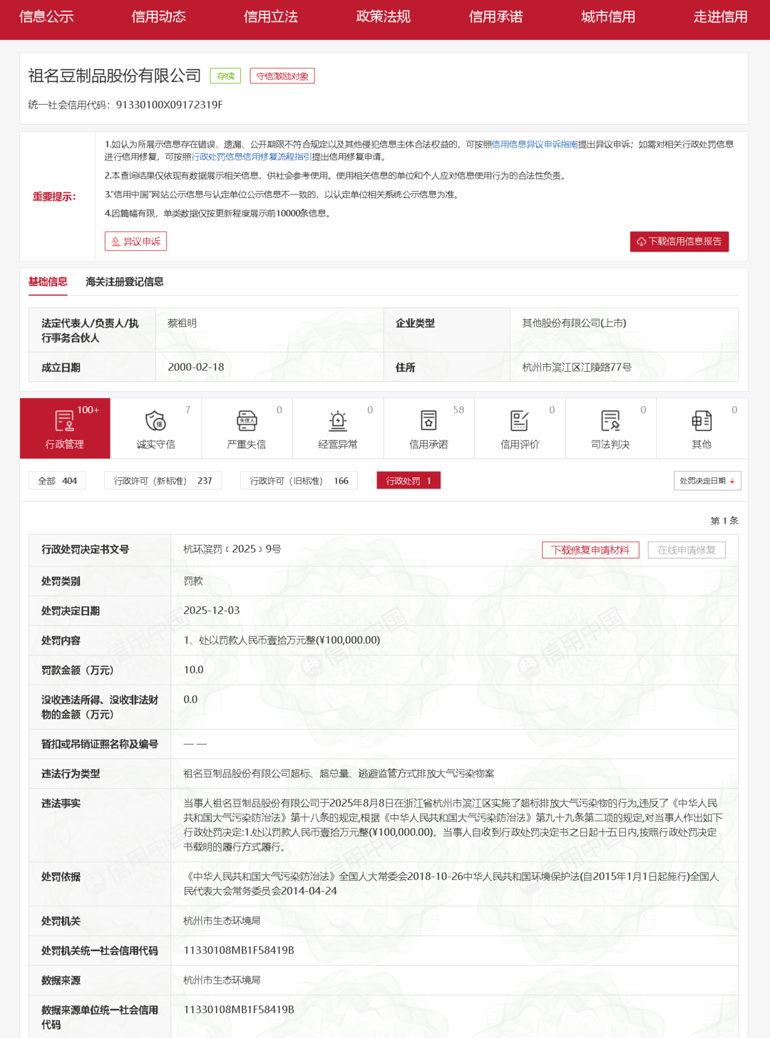 公司近期负面事件 - 祖名豆制品股份有限公司因超标、超总量、以逃避监管方式排放大气污染物,被杭州市生态环境局处以罚款人民币10万元 [1] - 该行政处罚决定书文号为杭环滨罚(2025)9号,处罚决定日期为2025年12月3日 [2] - 违法行为发生于2025年8月8日,违反了《中华人民共和国大气污染防治法》第十八条,处罚依据为该法第九十九条第二项 [2] 公司信用与行政处罚记录 - 根据“信用中国”网站公示信息,公司目前有1条行政处罚记录 [2] - 公司统一社会信用代码为91330100X09172319F,法定代表人为蔡祖明 [2] - 公司成立于2000年2月18日,注册地址为杭州市滨江区江陵路77号,企业类型为其他股份有限公司(上市) [2] 公司业务与经营概况 - 祖名股份始创于1994年,总部位于杭州,是集研发、生产、销售于一体的大型豆制品生产企业 [3][4] - 公司产品涵盖生鲜豆制品、植物蛋白饮品、休闲豆制品及其他类等 [3][4] - 公司旗下拥有7家全资子公司,3家控股子公司,3家孙公司及6家分公司 [3][4] - 业务覆盖浙江、江苏、安徽、上海、北京、山西、贵州及湖北等地,部分产品出口至美国、澳大利亚、加拿大、韩国等多个国家 [3] 公司产能与行业地位 - 公司在国内拥有7大生产基地,累计基地面积380亩,标准厂房面积31万平方米,年加工大豆能力超过15万吨 [3] - 公司是江浙沪地区的豆制品领导品牌之一,在该区域有较高的品牌知名度 [3] - 公司是农业产业化国家重点龙头企业、全国农产品加工示范企业、浙江省农业龙头企业和浙江省科技农业龙头企业 [3] - 公司是CAC国际标准以及国家标准、多个行业标准起草单位之一,并曾作为G20杭州峰会食材总仓供应企业及杭州第19届亚运会官方豆制品供应商 [3] 公司资本市场信息 - 公司于2021年1月6日在深圳证券交易所上市,股票简称为祖名股份,证券代码为003030 [3][4]