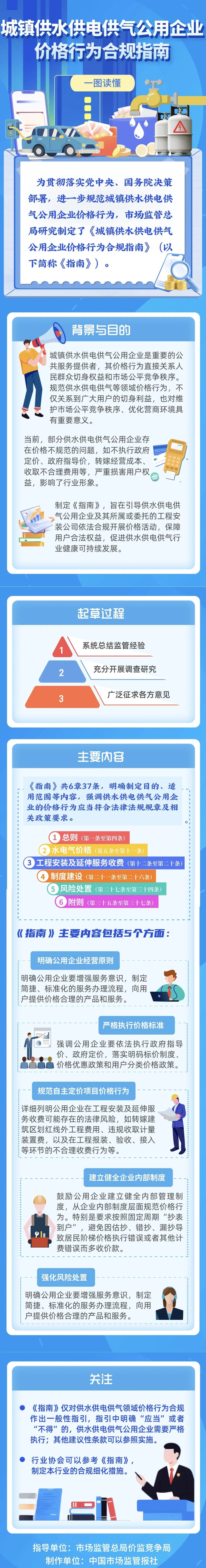 转自:中国市场监管报 (来源:中国市场监管报) 背景与目的 城镇供水供电供气公用企业是重要的公 共服务提供者,其价格行为直接关系人 民群众切身权益和市场公平竞争秩序。 规范供水供电供气等领域价格行为,不 仅关系到广大用户的切身利益,也对维 护市场公平竞争秩序、优化营商环境具 有重要意义。 当前,部分供水供电供气公用企业存 在价格不规范的问题,如不执行政府 定价、政府指导价,转嫁经营成本、 收取不合理费用等,严重损害用户权 益,影响了行业形象。 制定《指南》,旨在引导供水供电供 气公用企业及其所属或委托的工程安 装公司依法合规开展价格活动,保障 用户合法权益,促进供水供电供气行 业健康可持续发展。 起草过程 系统总结监管经验 1 充分开展调查研究 2 广泛征求各方意见 3 主要内容 《指南》共6章37条,明确制定目的、适 用范围等内容,强调供水供电供气公用企 业的价格行为应当符合法律法规规章及相 关政策要求。 1 总则(第一条至第四条) 水电气价格(第五条至第十一条) 2 工程安装及延伸服务收费(第十二条至第二十条) B 制度建设(第二十一条至第二十六条) FVAH 5 以 四大山直 (第二十七条至第三十四条) ...