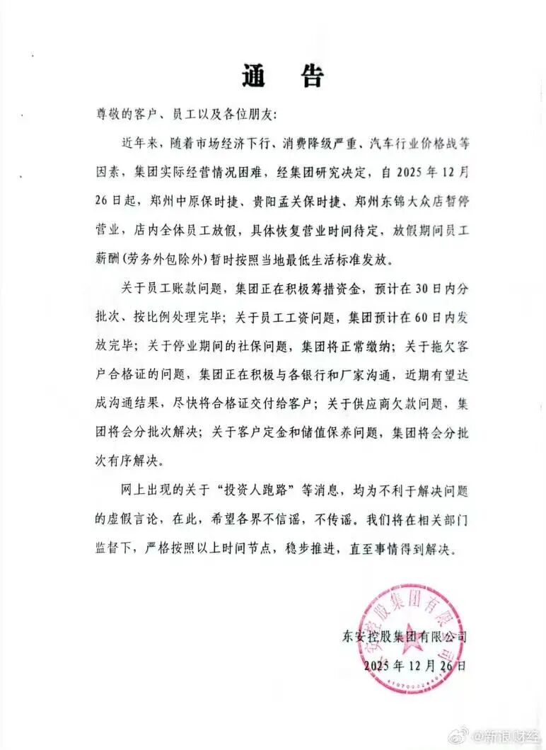 公司经营危机与官方回应 - 东安控股集团官方回应承认集团实际经营困难,决定自2025年12月26日起暂停郑州中原保时捷、贵阳孟关保时捷、郑州东锦大众三家门店营业,员工放假,薪酬按当地最低生活标准发放[1] - 公司否认“投资人跑路”传言,称其为虚假言论,并表示已成立专业团队处理问题,承诺会负责到底[4] - 公司计划在30日内分批次处理员工账款,60日内发放完毕员工工资,并正常缴纳停业期间社保,同时正与银行及厂家沟通以解决拖欠客户车辆合格证问题,客户定金和储值保养问题也将分批次有序解决[12] 门店关闭事件与直接冲击 - 郑州中原保时捷中心于12月23日被曝闭店,展厅车辆被清空,贵阳孟关保时捷中心随后也被曝出类似情况,据称是门店管理层人员将车辆开走,部分车辆已被抵押[3][6] - 闭店导致已支付定金的消费者无法提车,例如有客户支付了33万元定金订购保时捷911,同时购买了保养储值套餐的客户也面临权益无法兑现的风险,部分车主已报警求助[9] - 事件引发员工工资被拖欠,员工表示公司内部已召开会议承诺交代,相关部门已开始配合企业进行信息登记[6] 品牌方回应与经销商网络调整 - 保时捷中国回应称高度关注郑州中原保时捷中心的经营异常情况,正在与警方及相关部门核查事实,并积极推动事件处理,将消费者权益放在首位[11] - 保时捷中国此前已宣布对经销商网络进行动态调整,计划将网点数量从2024年年初的160家调整至2026年的100家[12] 公司背景与业务布局 - 东安控股集团曾是中国汽车流通行业百强企业,在2024年5月发布的排行榜中,以2023年62.01亿元人民币的营收和2.34万辆销量位列第80位[13] - 公司业务涵盖保时捷、宝马、奥迪等豪华品牌,大众、东风本田、一汽丰田等主流合资品牌,以及鸿蒙智行等新能源品牌[14] - 公司自2024年7月以来持续加码新能源赛道,接连布局三家鸿蒙智行门店,最近一家于2024年7月在河南安阳开业,其相关视频号在12月24日仍有更新[14] 行业转型背景 - 燃油车经销商面临困境与电动化转型大势紧密相关,电动化冲击下传统经销商盈利模式难以为继[18] - 行业出现传统豪华汽车经销商关店转做其他新能源品牌的趋势,建议传统经销商积极转型,引入新能源车型,提升售后服务,并探索跨界合作以拓展业务边界[18]