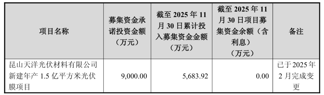 截至2025年11月30日,昆山天洋光伏材料有限公司新建年产1.5亿平方米光伏膜项目、南通天洋光伏材料科技有限公司太阳能封装胶膜项目、海安天洋新 材料科技有限公司新建年产1.5亿平方米光伏膜项目投入募集资金金额分别为5683.92万元、2.49亿元、9399.82万元,合计投入募资金额约4亿元。 | | | 截至 2025 年 11 | 截至 2025 年 11 | | | | --- | --- | --- | --- | --- | --- | | | 募集资金承 | 月 30 日累计投 | 月 30 日项目募 | | | | 项目名称 | 诺投资金额 | 入募集资金金额 | 集资金余额(含 | | 备注 | | | (万元) | (万元) | 利息) | | | | | | | (万元) | | | | 昆山天洋光伏材料有限公司 | | | | | 己于2025年 | | 新建年产 1.5 亿平方米光伏 | 9,000.00 | 5,683.92 | | 0.00 | 2 月完成变 | | 膜项目 | | | | | 用 | 断臂求生?天洋新材叫停光伏封装胶膜项目,4亿元募资"打水漂"。 12月22日晚 ...