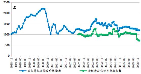 来源:中国金融信息网 图2 兴仁薏仁米批发价格走势 新华财经北京12月22日电(季超)截至2025年12月15日,兴仁薏仁米批发价格指数报1189.19点,较上 期(2025年11月30日,下同)环比持平;贵州薏苡仁批发价格指数报708.19点,环比持平。 图1 兴仁薏仁米批发价格指数走势 数据来源:新华财经数据库、兴仁市薏仁专业协会 综合分析,进入12月,市场转入交易淡季,批发市场内新陈薏仁米货源供应充足,商家多以随购随销的 模式维持日常运营,整体货源流通节奏平稳。受淡季需求疲软、货源供给稳定等多重因素叠加影响,薏 仁米市场行情持续在偏低位区间运行,最终促成价格指数环比持平的态势。 一、兴仁薏仁米市场行情 数据来源:新华财经数据库、兴仁市薏仁专业协会 图3 贵州薏苡仁批发价格走势 数据来源:新华财经数据库、兴仁市薏仁专业协会 二、指数规格品价格走势 图4 各规格品批发价格 数据来源:新华财经数据库、兴仁市薏仁专业协会 本期,精品兴仁薏仁米"98米"批发价格为16800元/吨,精品兴仁薏仁米"95米"批发价格为15800元/ 吨;兴仁薏仁米"98米"批发价格为11500元/吨,兴仁薏仁米"95米"批发价格为1 ...