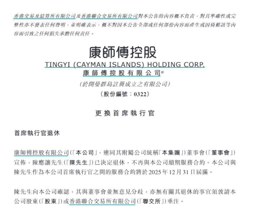 【导读】康师傅将于 2026 年 1 月 1 日更换首席执行官 中国基金报记者 郑俊婷 12 月 18 日,食品饮料巨头 康 师 傅(证券代码: 00322.HK )发布一则重磅人事公告, 宣布公司现任首席执行官陈应让决定退休,其服务合约将于 2025 年 12 月 31 日届满后不 再续签;自 2026 年 1 月 1 日起, 创始人家族第二代、 43 岁的 魏宏丞 将正式接任首席执 行官一职 。 这一关键任命标志着,在职业经理人掌舵十年后,康师傅的核心经营权将重归魏氏家族手 中。 少帅接棒 重回家族治理轨道 此番即将走马上任 " 新帅 " 魏宏丞,是一位兼具国际视野与一线业务经验的少帅。公开资料 显示,魏宏丞本科毕业于伦敦帝国学院,后获得哈佛商学院工商管理硕士学位。在加入家族 企业前,他曾就职于黑石集团纽约办公室及百事公司总部,拥有顶级投资机构和快消巨头的 历练背景。 魏宏丞并非突然被推至台前。公告显示,他自 2015 年 2 月起进入康师傅体系,担任康师傅 饮品控股有限公司董事,并从 2019 年起出任该公司董事长。 康师傅称,在魏宏丞领导下,康师傅饮品战略决策高效落地,营收与利润连年稳健增长。他 坚持 ...