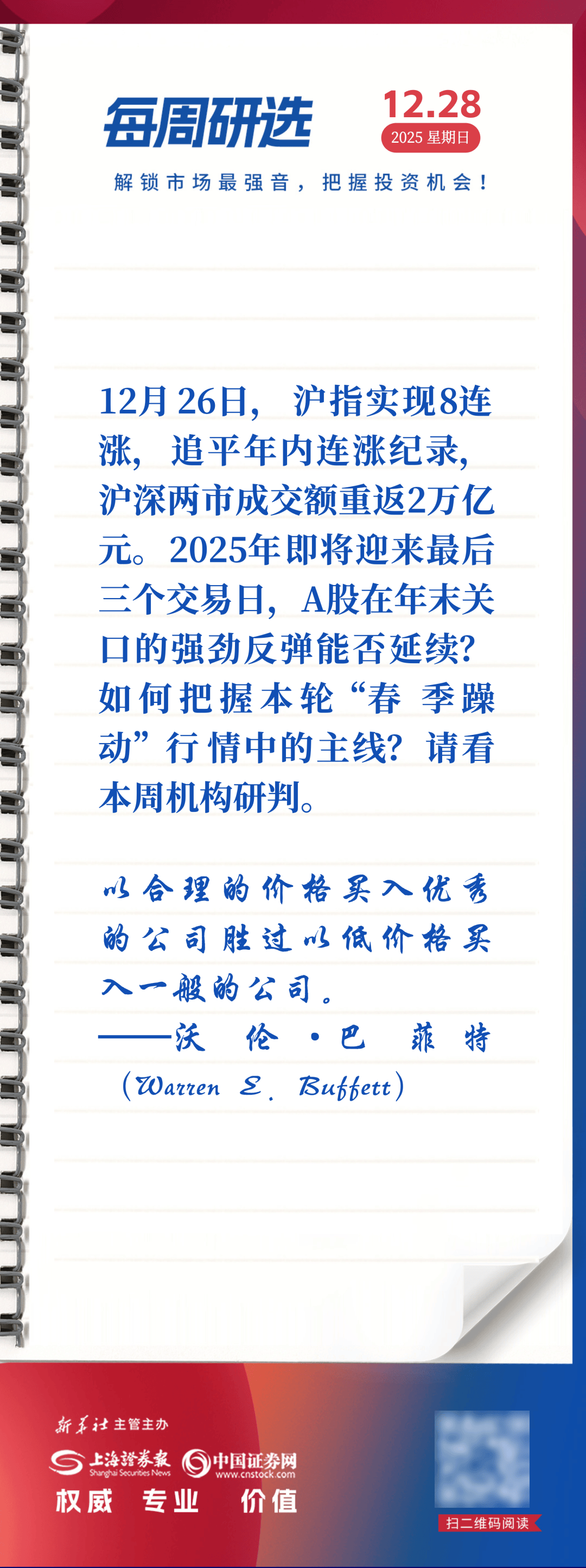 雷周研选 1 2.28 2025 星期日 解锁市场最强音,把握投资机会! 12月26日, 沪指实现8连 涨,追平年内连涨纪录, 沪深两市成交额重返2万亿 元。2025年即将迎来最后 三个交易日,A股在年末关 口的强劲反弹能否延续? 如何把握本轮"春 季躁 动"行情中的主线?请看 本周机构研判。 12月26日,沪指实现8连涨,追平年内连涨纪录,沪深两市成交额重返2万亿元。2025年即将迎来最后三个交易日,A股在年末关口的强劲反弹能否延续? 如何把握本轮"春季躁动"行情中的主线?请看本周机构研判。 兴业证券: 中泰证券: 春节前行情整体仍具备上行空间 从盘面结构看,本周指数的上行主要由有色金属为主的周期板块带动。从资金与交易特征看,市场整体风险偏好修复的迹象较为明显。展望后市,春节前 行情整体具备上行空间,短期仍有逢低布局机会,市场风险偏好有望维持较高水平。不过,需要强调的是,当前市场更符合"底部夯实后、为春节前行情 做准备"的阶段特征,而非主升浪正式开启阶段。当前市场资金更多采取"逢低布局、结构切换"的参与方式,而非在高位进行趋势性加仓。这决定了短期 行情更可能以"震荡中逐步抬高重心、内部结构持续调整"的方式演 ...