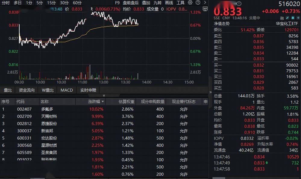 化工板块今日(12月23日)继续猛攻,反映化工板块整体走势的化工ETF(516020)早盘低位震荡后突然拉升,盘中场内价格最高涨幅达到 1.33%,截至发稿,涨0.73%。 成份股方面,氟化工、锂电等板块部分个股涨幅居前。截至发稿,多氟多、天赐材料双双涨停,恩捷股份大涨超6%,新宙邦涨超5%,宏达股 份、星源材质涨超2%。 | 分时 多日 1分 5分 | | | 15分 30分 ୧୦સ | | | F9 盘前盘后 叠加 九转 画线 工具 & 2 > | | | | CD | 516020 | | --- | --- | --- | --- | --- | --- | --- | --- | --- | --- | --- | --- | | 0.838 | | | 13:48 6 0.833 | ANNA | * 0.006(0.73%) 均价 0.833 成交量 0 IOPV 0.8. | | | | (0): 3 3 SSE CNY 13:48:16 交易中 | | +0.006 +0.73% 中 / @ + | | 0:833 | | | | | | | | 0.6798 | 净值走势 | | 华宝化工 ...