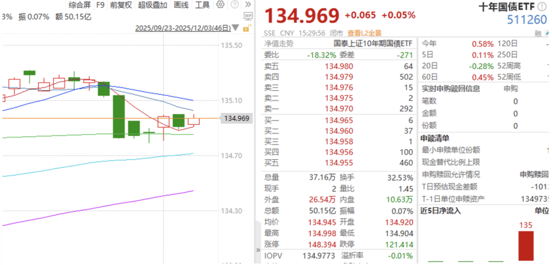 央行公开市场操作及市场反应 - 12月2日晚间,央行进行500亿元人民币的国债买卖操作[1] - 此次操作对债市整体走势的影响不及市场预期[1] - 30年期国债利率上行2.40个基点,达到2.23%[1] - 10年期国债走势相对平稳,对应ETF(511260)在操作次日微涨0.05%[1] 十年国债ETF市场表现 - 十年国债ETF(511260)当日收盘价为134.969元,上涨0.065元,涨幅0.05%[2] - 当日成交总额为50.15亿元人民币,振幅为0.07%[2] - 该ETF近5日涨幅0.11%,近20日下跌0.28%,近60日上涨0.45%,今年以来上涨0.58%[2] - 其52周价格区间介于52周低点与52周高点之间[2] - 当日IOPV(基金份额参考净值)为134.9773元,溢折率为-0.01%[2] 当前债市宏观与交易环境分析 - 债市宏观环境与交易情绪出现明显分野[2] - 宏观“弱现实”仍对低利率环境构成支撑,供需错配问题尚未看到实质性改善,经济仍处在新旧动能转换时期,社会整体名义增长率偏弱[2] - 金融层面,社会融资规模回落,M1拐点初现[2] - 资金成本整体平稳,货币政策导向非常温和,旨在避免引导债市形成单边预期[2] - 综合因素导致年内债市走势“有些失去方向”[2] 机构观点与投资建议 - 财通证券对12月债市保持适度乐观[3] - 自11月以来,资金利率开始向下突破,DR001(银行间市场存款类机构隔夜质押式回购利率)击穿1.31%,并在12月进一步下滑,这可能是货币政策的进一步指引[3] - 由于宏观现实的支撑,10年及以下期限国债的下跌空间不大,近期的悲观情绪反而跌出了(投资)空间[3] - 随着资金利率的进一步突破,市场或许能够搏取一定的反弹[3] - 建议投资者关注国债ETF(511010)和十年国债ETF(511260)[3]