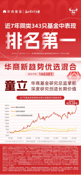 当"高研值"遇上基金,会碰撞出什么样的火花? 作为一家资深的资产管理机构,华商基金长期以来潜心打造"深度研究赋能投资"的闭环,倡导"深度研 究、投研一体化"的投研文化建设。这种"深耕细作"带来的成果是,华商基金旗下涌现出一大批长期业 绩表现亮眼的产品,证明着华商基金投研体系的长期生命力。 以华商基金旗下主动权益精品华商新趋势优选灵活配置混合基金为例,截至2025年8月25日,华商新趋 势优选灵活配置混合成立以来净值增长率录得461.98%,近1年净值增长率录得51.47%。另据银河证券 数据显示,华商新趋势优选灵活配置混合近7年业绩位列同类第一! 基金业绩排名评价数据来自银河证券2025年8月发布,数据截至2025年7月31日,近5年(20200801- 20250731)、近7年(20180801-20250731)业绩同类排名数据分别为5/434、1/343,基金类型为灵活配 置型基金(基准股票比例60%-100%)(A类)。成立以来(基金成立日20150514-20250825)、近10年 (20150826-20250825)、近7年(20180826-20250825)、近5年(20200826-2 ...
