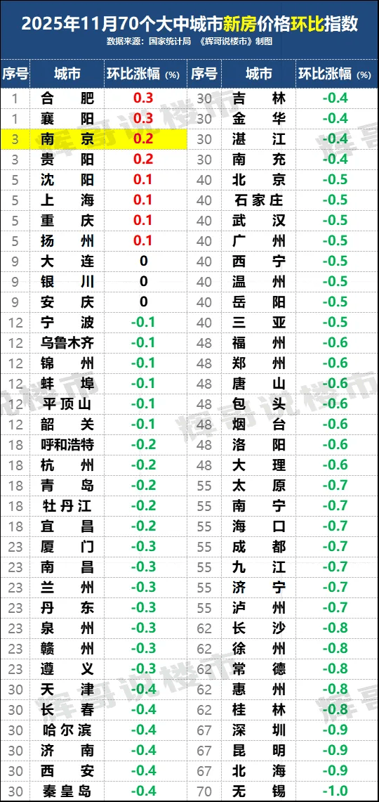数据显示,11月南京新房价格环比上涨0.2%,并列排名全国第三,仅次于合肥、襄阳的0.3%。这也是自今年4月至10月连跌7个月后,南京新房价格迎来 止跌回涨。 | | | | 数据来源:国家统计局 | 2025年11月70个大中城市新房价格环比指数 | 《辉哥说夜市》制图 | | | | --- | --- | --- | --- | --- | --- | --- | --- | | 序号 | 城市 | | 环比涨幅 (%) | 序号 | | 城市 | 环比涨幅 (%) | | 1 | 글 | H | 0.3 | 30 | 直 | 林 | -0.4 | | 1 | 童 | RE | 0.3 | 30 | ਵੇ | સ્ટ | -0.4 | | 3 | Fa | 京 | 0.2 | 30 | 漫 | 江 | -0.4 | | 3 | 貴 | RE | 0.2 | 30 | F | 35 | -0.4 | | 5 | 沈 | RE | 0.1 | 40 | नह | 문 | -0.5 | | 5 | - | 海 | 0.1 | 40 | | 句家庄 | -0.5 | | 5 | E | 大 | 0.1 | 40 ...