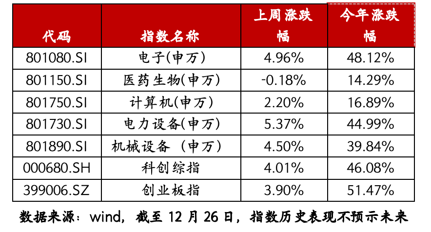 科技板块整体表现 - 上周科创、创业板块开启反弹,各细分行业中仅医药生物下跌0.18%,其余行业均有较好的反弹涨幅 [1] - 电子行业上周涨幅为4.96%,今年累计涨幅达48.12% [2] - 电力设备行业上周涨幅为5.37%,今年累计涨幅达44.99% [2] - 机械设备行业上周涨幅为4.50%,今年累计涨幅达39.84% [2] - 计算机行业上周涨幅为2.20%,今年累计涨幅达16.89% [2] - 科创综指上周上涨4.01%,今年累计上涨46.08% [2] - 创业板指上周上涨3.90%,今年累计上涨51.47% [2] 科创宽基指数概况 - 上周科创100指数、科创综指指数以及创业板指数均上行 [3] - 截至今年12月26日,科创100指数合计上涨43.03%,科创综指上涨57.62%,创业板指上涨77.00% [3] - 2025年截至12月26日,科创100指数上涨58.73%,科创综指上涨50.80%,创业板指上涨57.44% [3] 电子行业动态 - 英伟达以200亿美元现金价格购买Groq的技术授权,获得其所有资产与技术授权,但GroqCloud云端业务维持独立运作 [5] - Groq的创始人Jonathan Ross、总裁Sunny Madra及团队其他成员将加入英伟达 [5] - 英伟达表示Groq的低延迟芯片响应速度快,将为英伟达产品带来新能力,帮助开拓新市场 [5] - 受存储巨头产能全力转向AI用HBM影响,TrendForce预计DDR5内存价格将在2026年底前再涨45% [7] - 因核心成本增加,联想、惠普等头部厂商或将被迫推迟2026年新品发布计划 [7] 医药生物行业动态 - 诺和诺德口服司美格鲁肽在美获批,这是全球首款获批用于体重管理的口服GLP-1受体药物 [7] - 该药物用于减轻体重并长期维持体重减轻,以及降低发生重大不良心血管事件的风险 [7] - 在OASIS 4试验中,其减重效果与注射用Wegovy相似,安全性和耐受性也与既往研究一致 [7] - 诺和诺德计划于2026年1月初在美国上市该产品 [7] - 国家药监局发布优先审批高端医疗器械目录(2025版),植入式脑机接口医疗器械被列入 [8] - 预计2026年Q1脑机接口注册证将逐步落地 [8] - 国家医保局印发《神经系统类医疗服务价格项目立项指南(试行)》,新增侵入式脑机接口置入费和取出费项目,为脑机接口收费打开通路 [8] 计算机行业动态 - 上海证券交易所发布《上海证券交易所发行上市审核规则适用指引第9号——商业火箭企业适用科创板第五套上市标准》 [9] - 商业火箭研制及发射业务处于商业航天产业链中游,承担关键枢纽职能 [9] - 商业火箭行业研发投入大、周期长,未实现规模商业化,亟需资本市场支持 [9] - 《指引》将适用科创板第五套上市标准的阶段性成果明确为:"在申报时至少实现采用可重复使用技术的中大型运载火箭发射载荷首次成功入轨" [9] 电力设备行业动态 - 上周多晶硅n型复投料成交均价为5.39万元/吨,周环比上涨1.32% [10] - 上周国内多晶硅市场价格小幅上涨,主流签单企业数量环比上周小幅增加,成交价格较上周上调1-2元/公斤 [10] - 硅料价格上涨为下游各环节价格的企稳回升提供了底部支撑 [10] - 上周硅片价格明显走强,整体呈现较上周大幅上行的态势,随着行业自律议题持续发酵,硅片厂报价整体上抬 [10] - 湖南裕能从2026年1月1日起对部分产线进行检修,预计一个月,减少的磷酸盐正极产量在1.5-3.5万吨 [11] - 万润新能在2025年12月28日起进行1个月的检修,减少的铁锂正极产量在0.5-2万吨 [11] - 德方纳米将在2026年1月1日起进行1个月的检修 [11] - 近期碳酸锂价格的快速上涨,加剧了磷酸铁锂正极企业的成本压力,预计也进一步增强了行业的挺价意愿 [11] 机械设备行业动态 - 在第十五届全国运动会中,国产人形机器人首次担任拳击项目颁奖嘉宾,完成奖牌递送、敬礼、合影等全流程操作 [11] - 优必选工业人形机器人Walker S2正式进入批量交付阶段,首批数百台设备已投入汽车制造、智慧物流与智能制造产线 [12] - Walker S2月产能突破300台,实现7×24小时不间断作业与自主换电能力 [12] - 优必选发布原速原声一镜到底视频,回应海外企业对其交付视频"特效质疑"的争议,证实现场多机协同作业的真实性 [12] 市场配置观点 - 当前科创综指、科创100指数、创业板指数总体处于产业周期向好趋势,中长期可关注相关产业趋势 [13] - 近期科技板块热点催化较多,叠加春季躁动行情逐步启动,国内科技板块近期走势有望向好 [13]