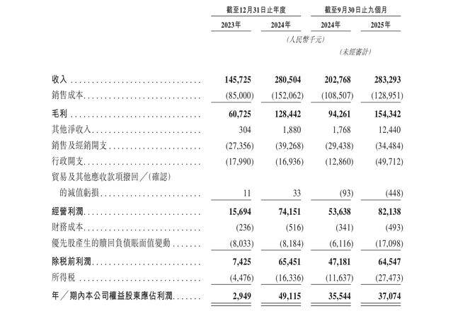 | | 截至12月31日止年度 | | 截至9月30日止九個月 | | | --- | --- | --- | --- | --- | | | 2023年 | 2024年 | 2024年 | 2025年 | | | | (人民幣千元) | | | | | | | (未經審計) | | | 收入 | 145,725 | 280,504 | 202,768 | 283,293 | | 销售成本 | (85,000) | (152,062) | (108,507) | (128,951) | | 毛利 | 60,725 | 128.442 | 94,261 | 154.342 | | 其他淨收入 | 304 | 1.880 | 1.768 | 12,440 | | 銷售及經銷開支 | (27,356) | (39,268) | (29,438) | (34.484) | | 行政開支 ... | (17,990) | (16,936) | (12,860) | (49,712) | | 貿易及其他應收款項發回 /(確認) | | | | | | 的減值虧損 ... | 11 | 33 | (93) | (448) ...