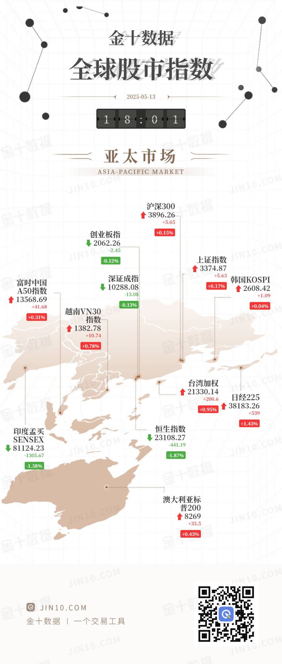 金十图示:2025年05月13日(周二)亚太市场股市指数(收盘)
