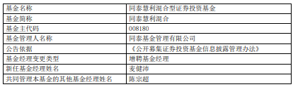| 基金名称 | 同泰慧利混合型证券投资基金 | | --- | --- | | 基金简称 | 同泰慧利混合 | | 基金主代码 | 008180 | | 基金管理人名称 | 同泰基金管理有限公司 | | 公告依据 | 《公开募集证券投资基金信息技露管理办法》 | | 基金经理变更类型 | 增聘基金经理 | | 新任基金经理姓名 | 麦健沛 | | 共同管理本基金的其他基金经理姓名 | 陈宗超 | 中国经济网北京5月19日讯 今日,同泰基金公告,同泰慧利混合增聘麦健沛。 麦健沛2020年7月加入同泰基金管理有限公司,曾任投资研究部行业研究员,现任投资研究部基金 经理。 同泰慧利混合A/C成立于2020年7月3日,截至2025年5月16日,其今年来收益率为-0.43%、-0.59%, 累计收益率为25.58%、23.17%,累计净值为1.2491元、1.2262元。 (责任编辑:康博) ...