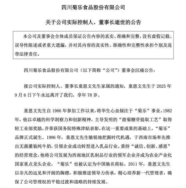 瑞财经 吴文婷9月8日,菊乐股份发布公告称,接公司实际控制人、董事长童恩文家属的通知,童恩文于2025年9月6日下午去世,享年78岁。 前不久,菊乐股份第三届董事会第十七次会议召开。董事会作出决定:在童恩文缺席期间,由其女婿、美籍高管GAO ZHAOHUI代行董事长职权,同时兼任 战略与发展委员会主任委员等关键职务。 值得注意的是,菊乐股份正在冲刺北交所IPO,而这也是其第五次冲击IPO。 二、议案审议情况 公告称,童恩文自1966年参加工作以来,将毕生心血倾注于"菊乐"事业。童恩文的离世,使公司失去了一位伟大的企业家、一位睿智的导师和一位慈祥的长 者,他留下的宝贵物质与精神财富,将持续滋养和引领公司未来的发展。 童恩文通过直接及间接方式控制公司73.35%的表决权,为公司实际控制人。其所持的公司股份将按相关法律法规办理相关手续,公司将根据后续事项进展 情况及时履行信息披露义务。 而菊乐股份的主营业务为含乳饮料及乳制品的研发、生产和销售。截至发稿时,公司官网已调整为黑白界面,以示哀悼。 (一)审议通过《关于推举董事 GAO ZHAOHUI 先生代为履行董事长职务的议 公告编号: 2025-041 案》 1.议 ...