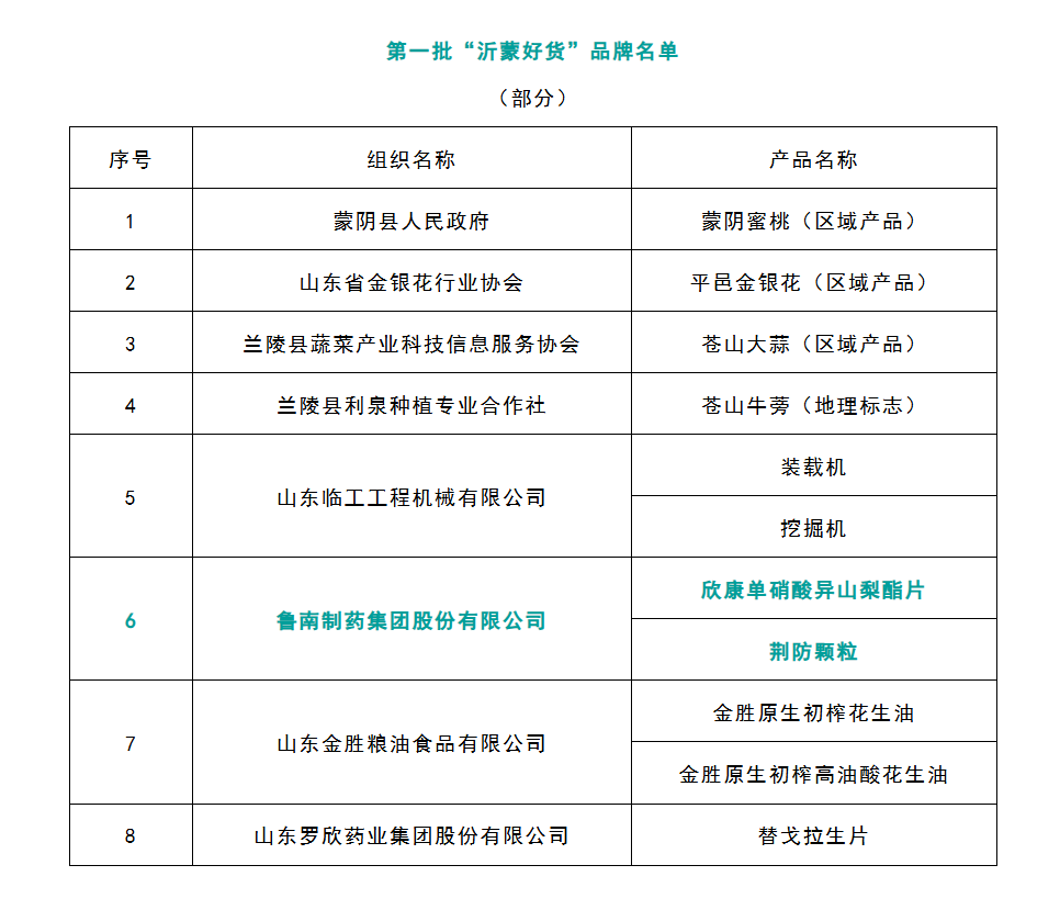 齐鲁晚报.齐鲁壹点通讯员朱佳庚 鲁南制药集团相关负责人表示,未来将以此为契机,充分发挥品牌示范引领作用,持续加大研发投入,提升产品创新能力与核心竞争 力,不断推出更多高品质、高疗效的医药产品,为保障民众健康、推动区域医药产业高质量发展贡献更大的品牌力量。 | | | | 序号 | 组织名称 | 产品名称 | | --- | --- | --- | | 1 | 蒙阴县人民政府 | 蒙阴蜜桃(区域产品) | | 2 | 山东省金银花行业协会 | 平邑金银花(区域产品) | | 3 | 兰陵县蔬菜产业科技信息服务协会 | 苍山大蒜(区域产品) | | র্ব | 兰陵县利泉种植专业合作社 | 苍山牛蒡(地理标志) | | 5 | 山东临工工程机械有限公司 | 装载机 | | | | 挖掘机 | | ર | 鲁南制药集团股份有限公司 | 欣康单硝酸异山梨酯片 | | | | 荆防颗粒 | | 7 | 山东金胜粮油食品有限公司 | 金胜原生初榨花生油 | | | | 金胜原生初榨高油酸花生油 | | 8 | 山东罗欣药业集团股份有限公司 | 替戈拉生片 | 此次"沂蒙好货"品牌的遴选工作,旨在加强产业和区域品牌建设,打 ...