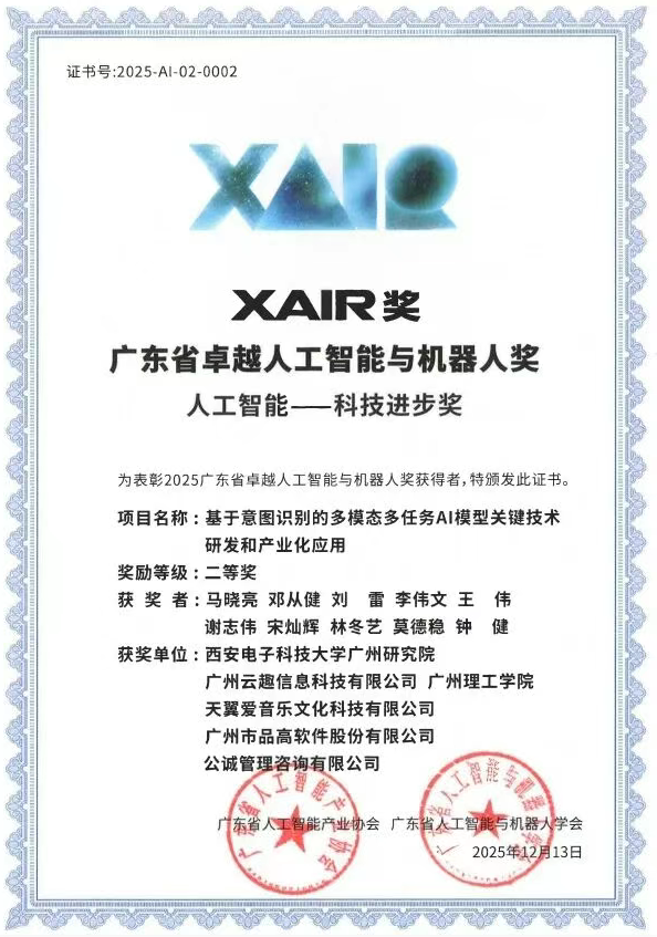 经过激烈角逐,由州市品软件股份有限公司(品高股份688227.SH)联合西安电科技学州研究院、州云趣 信息科技有限公司、州理学院、天翼爱乐化科技有限公司、公诚管理咨询有限公司等单位共同申报的 《基于意图识别的多模态多任务AI模型关键技术研发和产业化应》项目荣获2025年度XAIR奖"人工智能 ——科技进步奖"二等奖。 近日,2025年粤港澳大湾区人工智能与机器人产业大会暨广东省人工智能与机器人技能大赛圆满落幕。 大会以"智联世界湾区新篇"为主题,旨在搭建政产学研用商融合的高端平台,汇聚创新资源,推动技术 突破与产业融合,为大湾区培育新质生产力、打造具有国际影响力的创新高地注入强劲动能。 为表彰在人工智能与机器人领域取得突出贡献的项目,进一步指引产业发展路径,大会期间举行 了"2025年度广东省卓越人工智能与机器人奖(XAIR奖)"颁奖典礼。评审工作由毛军发院士担任主席,汇 集了ACM图灵奖得主John Hopcroft教授、陈国良院士等全球顶尖专家。 以"品原AI一体机"为全国产算力核心,用户可基于"云-边-端"一体化协同架构,通过品高智算底座实现 跨层级算力调度和资源协同。同时,品高股份提供完整的驱动、算子 ...