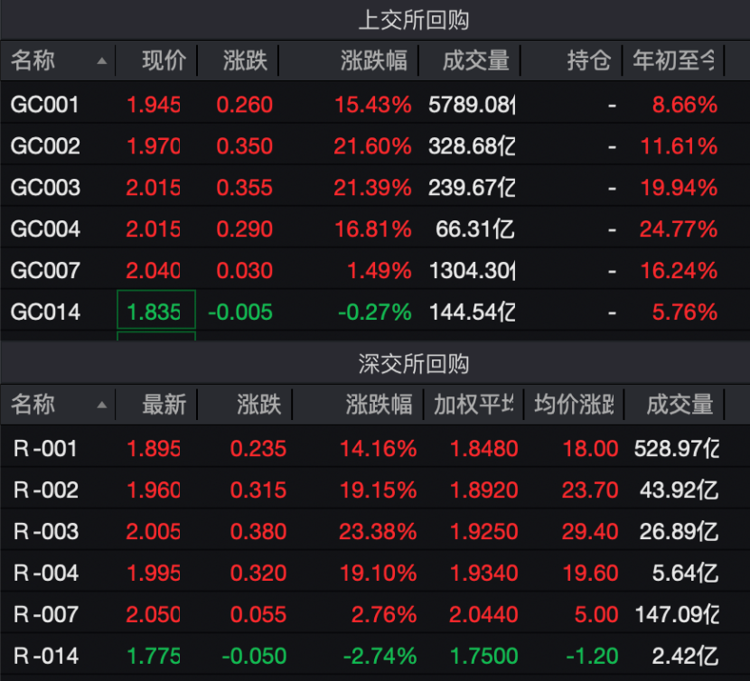临近2026年元旦小长假,沪深交易所国债逆回购收益率又开始大幅上涨,在计息天数方面也迎来比较好的窗口期。 根据沪深交易所国债逆回购计息规则测算,今天(2025年12月29日)和明天(2025年12月30日)或是本次小长假前较好的国债逆回购操作时间窗口,能享 受相对较多的计息天数,其中在今天操作3天期至7天期的国债逆回购,计息天数均达到7天。 沪深交易所多个期限国债逆回购收益率大涨 今天上午,沪深交易所国债逆回购收益率大幅拉升,多个期限的国债逆回购品种年化收益率突破2%。 | | | | 上交所回购 | | | | | --- | --- | --- | --- | --- | --- | --- | | 名称 ▲ | 现价 | 涨跌 | 涨跌幅 | 成交量 | 持仓 年初至今 | | | GC001 | 1.945 | 0.260 | | 15.43% 5789.081 | | 8.66% | | GC002 | 1.970 | 0.350 | | 21.60% 328.68亿 | - | 11.61% | | GC003 | 2.015 | 0.355 | | 21.39% 239.67亿 | - | 19 ...
