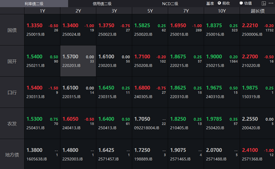 市场整体表现 - 短端债券利率继续上涨,长端债券利率窄幅震荡 [1] - 银行间主要利率债收益率涨跌不一,10年期国债活跃券250016收益率上行0.25个基点至1.8375%,30年期国债活跃券2500006收益率下行0.2个基点至2.221%,10年期国开活跃券250215收益率上行0.2个基点至1.9% [1] 利率债二级市场 - 国债方面,1年期收益率下行0.5个基点至1.3350%,10年期收益率上行0.25个基点至1.8375%,30年期(超长债)收益率下行4.2个基点至2.2210% [2] - 国开债方面,1年期收益率上行0.5个基点至1.5400%,10年期收益率上行0.2个基点至1.9000% [2] - 口行债方面,1年期收益率下行1.5个基点至1.5400%,10年期收益率上行0.5个基点至1.9675% [2] - 农发债方面,1年期收益率上行0.75个基点至1.5300%,10年期收益率上行0.35个基点至1.9785% [2] - 地方债方面,10年期收益率下行1个基点至2.4100% [2] 交易所信用债市场 - 交易所非金融信用债涨幅前五均为万科相关债券,其中“22万科04”涨幅最大,达18.46%,最新收盘价26.6525元,成交额2.85万元,最新到期收益率55.4134%,收益率下行850.35个基点 [3] - “24深铁06”涨幅2.96%,最新收盘价100.3095元,成交额1404.33万元,最新到期收益率2.93%,收益率下行27.04个基点 [3] - “22万科02”涨幅2.28%,“23万科01”涨幅2.13%,“21万科04”涨幅1.86% [3] - 交易所非金融信用债跌幅前五包括“24产融08”、“23江东01”、“21乌城01”、“24产融04”、“21锡建03” [4] 市场分析与资金面 - 资金面维持宽松,但市场对货币政策适度宽松的预期有所修正,制约利率大幅下行 [4] - 今年配置盘抢跑情况有限,使得长端与超长端债券收益率维持宽幅震荡格局 [4] - 利率向上突破需要看到通胀显著回升,向下突破则需要降息引导,短期债市难以摆脱区间震荡格局 [4] - 央行12月24日开展260亿元7天期逆回购操作,利率1.40%,当日有468亿元逆回购到期,实现单日净回笼208亿元 [4] - Shibor短端品种表现分化,隔夜品种下行0.5个基点至1.267%,创2023年8月以来新低;7天期下行1.4个基点至1.385%,创2022年8月以来新低;14天期上行2.2个基点至1.599%;1个月期上行1.2个基点至1.579% [5] - 银行间回购定盘利率表现分化,FR007跌3.0个基点至1.5%,FR014涨7.0个基点至1.75% [5] - 银银间回购定盘利率多数下跌,FDR001跌1.0个基点至1.27%,FDR007跌4.0个基点至1.38% [5] - 存款类机构间回购利率(DR)方面,DR001下行5.89个基点至1.2411%,DR007上行5.00个基点至1.3800%,DR014下行5.00个基点至1.6000% [5] 存单市场 - 一级存单方面,3个月期国股行存单在1.57%-1.62%位置需求较好,1年期国股行存单报在1.60%-1.64%位置 [6] - 二级存单方面,6个月期国股行存单成交在1.6250%附近,较前一日上行1.25个基点;1年期国股行存单成交在1.6450%位置,较前一日上行0.75个基点 [6] - 国有大行存单报价显示,1个月期利率1.6350%,3个月期利率1.6175%,6个月期利率1.6250%,1年期利率1.6450% [7] - 股份制银行存单报价显示,1个月期利率1.6350%,3个月期利率1.6300%,6个月期利率1.6300%,1年期利率1.6410% [7]