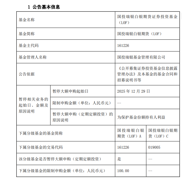 每经AI快讯,12月25日,国投白银LOF:限制本基金A类基金份额定期定额投资金额为100.00元。调整 本基金A类基金份额大额定期定额投资业务的起始日为2025年12月29日。 ...