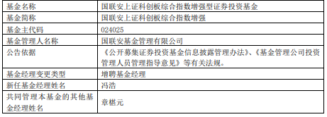 基金人事变动 - 国联安基金管理有限公司增聘冯浩为国联安上证科创板综合指数增强型证券投资基金的基金经理 [1][2] - 新任基金经理冯浩于2025年7月加入国联安基金管理有限公司,此前曾任职于上海锐联景淳投资管理有限公司,担任研究员和基金经理 [1] - 该基金目前由冯浩与童甚元共同管理 [2] 基金产品信息 - 国联安上证科创板综合指数增强型证券投资基金的A/C份额成立于2025年8月29日 [1] - 该基金的主代码为024025 [2] - 基金管理人为国联安基金管理有限公司 [2]