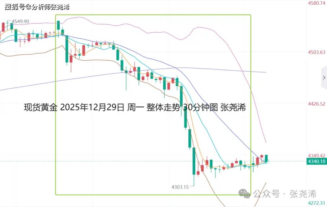 展望今日周二(12月30日):国际黄金开盘受到日图中轨支撑的买盘推动,以及地缘局势周末及周一的升级的利好提振,而先行止跌偏回升,虽然美元指数 昨日震荡收跌未对金价产生看涨支撑,但方向上的影响仍是美元改变,其日图走势保持在布林带下方,有进一步向下延伸的预期,周图及月图也是入场, 这暗示金价前景依然偏向看涨,就算不再度攀升,也是宽幅震荡行情,故此,无论是解套还是波段操作都有机会。 张尧浠:金银获利了结跳水调整、中长期看涨前景仍不变 上交易日周一(12月29日):国际黄金大幅回落收跌,重挫200多美元,在经过上周的多头狂欢和白银的暴涨疯狂,在经过周末的消化之后,本周开盘,同 时也是年内收官之际,更多的是选择获利了结,一日即收复上周一周涨幅,空头力量加大,但整体仍运行在目前的回升趋势之中,同时也是属于正常的技 术性调整,下方也有5周及10周,以及20日及30日等均线支撑,故此,目前在回落触及此等支撑位置,仍先进行看涨为主。 具体走势上,金价自亚市高开5美金于4537.12美元/盎司,直接走强录得日内高点4548.58美元后,回撤走低表现,一路延续到美盘时段,空头力量加大, 连续坠落下行,到23点时段触及日内低点430 ...
