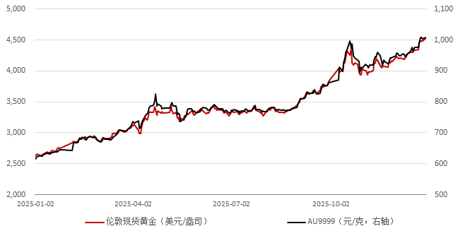 黄金市场表现与价格动态 - 2025年12月26日,国际黄金价格站上4540美元/盎司,创历史新高,尾盘收于4533.34美元/盎司,日涨幅1.19%,周涨幅4.49% [1] - 2025年全年,黄金成为全球主要资产中表现最突出的品种之一,累计涨幅高达70%以上,而同期标普500指数仅上涨约17% [2] - 过去三个多月,黄金价格始终依托多头趋势线运行,并成功站上4500美元/盎司关口,市场尚未出现能结构性扭转多头趋势的实质性空头行情 [4] 黄金价格上涨的核心驱动因素 - 主要驱动力来自避险资金流入,以及市场对美联储可能以激进节奏重启降息的预期不断升温 [2] - 地缘政治紧张局势(如俄乌冲突、中东摩擦、印度与巴基斯坦紧张局势、苏丹内战)强化了黄金的避险资产属性,是推动2025年上涨的重要力量 [2] - 各国央行持续通过囤积黄金实现储备多元化,2025年前三季度全球央行净购金总量达634吨,虽低于过去三年高位,但仍显著高于2022年前的平均水平,对金价形成强大底层支撑 [3] 美联储货币政策预期 - 美联储在2025年9月重启宽松周期,降息25个基点,10月又进行了同等幅度降息 [2] - 受经济数据疲软迹象及政策制定者鸽派信号影响,市场对12月连续第三次降息的概率预期攀升 [2] - 展望2026年,市场预计将有60个基点的额外宽松空间,相当于两次25个基点的降息,以及潜在的第三次降息 [2] 技术指标与关键价位分析 - 相对强弱指标已突破70的超买临界值,表明短期买盘力量过度透支,市场短期回调风险正在加大 [4] - MACD指标的红色能量柱持续在零轴上方放量,印证短期均线系统中黄金的多头上涨动能仍未消退 [4] - 4600美元/盎司是关键心理阻力位,若有效突破可能开启新一轮强劲单边上涨 [5] - 4300美元/盎司是短期重要支撑位,为前期历史高点所在的中性震荡区间 [5] - 4200美元/盎司是关键强支撑位,紧邻50期简单移动平均线,一旦跌破可能使当前多头趋势面临破位风险 [5]