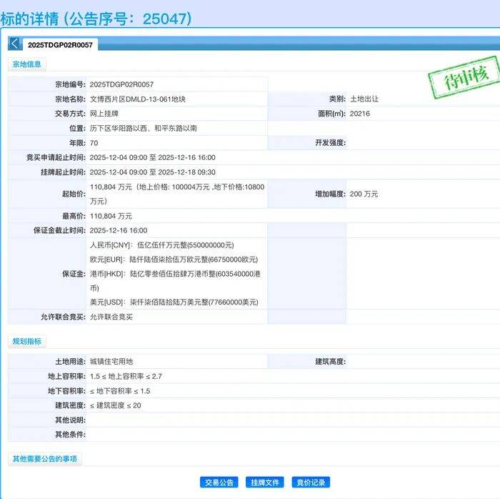 12月18日上午,历经延拍"小插曲"的济南文博西片区DMLD-13-061地块终迎成交, 楼面成交价20300 元/平方米,创下济南楼市土拍单价新纪录。 | 2025TDGP12R0062 | 2025TDGP12F0063 | | | | | --- | --- | --- | --- | --- | | 完地信息 | | | | | | | 宗地编号:2025TDGP12R0062 | | | | | | 采地名称: 盛福庄片区10街区局部用地SFZ1001-1地块 | | 类别:土地出让 | | | | 交易方式:网上挂牌 | | 面积(m): 46775 | | | | 位置:历城区风屋路以西、飞跃大道以南、风仪路以北 | | | | | | 年限:70 | | 开发强度: | | | | 费买申请起止时间: 2025-12-08 09:00 至 2025-12-16 16:00 | | | | | | 挂牌起止时间:2025-12-08 09:00 至 2025-12-18 09:30 | | | | | | 48,109 万元 (地上价格: 40891万元,地下价格:7218万 起始价: 元) | ...
