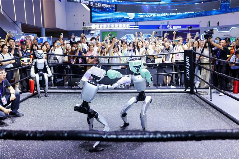 第四届全球数字贸易博览会在杭州开幕。 图为人形机器人现场"格斗"表演,吸引众多观展者驻足。 场景重塑 AI建构日常生活"微小确幸" "以前觉得AI离自己很远,现在才发现,它早已悄悄解决了生活里的'小痛点',这些'微小确幸',正是智能时 代最实在的礼物。"漫步展览,这是不少参展市民的普遍感受。 不妨看看这些场景吧:身高1.70米的人形机器人随着音乐节奏灵活出拳,引来观众阵阵惊呼;一墙之隔,重 量仅49克的Rokid智能眼镜,能实时将眼前场景转化为语音解说,帮视障人士"看见"世界;AI问诊机器人更能 处理常见病症咨询,联动附近社区医院预约挂号,构建起"筛查—咨询—就医"的闭环服务。 有触手可及的科技,也有上天入地的新奇。在地卫二空间技术(杭州)有限公司展台,许多观众正在排队体 验"跟着地卫二'数贸'上月球"拍照打卡活动。 "这些卫星的核心创新在于将数据中心级算力注入卫星,使其成为能在轨运行行业大模型的'在轨超级计算 机',而非简单的'太空相机'。"该公司现场工作人员告诉记者,在未来"嫦娥八号"的任务中,地卫二的AI月球 机器人将完成人类首次地外天体的"扫码支付",为打造"地—月数字贸易体系"奠定关键的技术基础。 ...