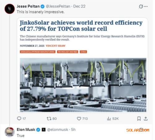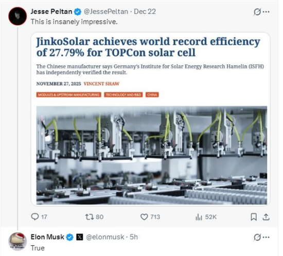 光伏巨头晶科能源,获马斯克"点赞"!公司回应 晶科能源(5.720. 0.10. 1.78%)日前宣布,其基于TOPCon技术平台的高效电池最高光电转换效率达 27.79%,经德国哈梅林太阳能(4.540. 0.04. 0.89%)研究所(ISFH)权威认证,刷新世界(8.450. -0.10. -1.17%)纪录。近日,社交平台X上的一位用户分享了有关晶科能源这项新纪录的报道,并评论称:"这 真是令人疯狂地印象深刻。"北京时间12月25日,马斯克对此帖回应称:"确实如此。" 12月25日,晶科能源相关负责人对上海证券报记者确认了上述信息。该负责人表示,随着美国AI算力 的蓬勃发展和加速建设,美国电力日益紧缺。以科技创新打破局限著称的马斯克也日益关注能源技术进 步,畅享未来太空算力并宣布4至5年内通过星舰实现每年100GW太空算力部署,并利用光伏技术实现 能源供应。"我们认为,本次电池效率纪录是晶科能源以TOPCon技术为核心,持续深耕、厚积薄发的新 高度和集中体现。TOPCon技术平台具有持续提效可行性与巨大潜力,且可与下一代钙钛矿叠层技术完 美融合,助力公司持续引领光伏行业技术创新。"晶科能源相关负责人表 ...