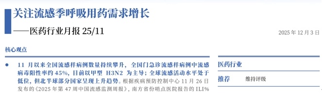 流感疫情与市场需求 - 国家流感中心监测显示,2025年11月24日至11月30日,我国流感活动继续上升,预测秋冬流感高峰可能出现在12月中下旬至明年1月初 [1] - 市场对抗病毒药物及对症治疗药物的需求大幅增长,儿童作为流感易感人群用药需求尤为迫切 [1] - 美团买药数据显示,11月以来甲流乙流特效药整体订单量增长超过1倍,磷酸奥司他韦颗粒订单增长整体超过85%,玛巴洛沙韦增长超110% [1] 葫芦娃药业产品布局与表现 - 公司磷酸奥司他韦胶囊剂已获批生产并稳定供应市场,适用于甲型、乙型流感的预防与治疗 [3] - 公司研发的磷酸奥司他韦干混悬剂于今年9月获得药品注册证书,满足2周岁及以上低龄患儿用药需求,解决了低龄儿童服用抗流感药物“剂量难把控”的问题 [3] - 公司核心中成药产品小儿肺热咳喘颗粒已连续多年入选国家卫健委《流行性感冒诊疗方案》,并纳入国家医保目录,被多省市纳入地方流感诊疗指南 [3] - 公司生产的复方氨酚烷胺胶囊、布洛芬混悬滴剂、乙酰半胱氨酸溶液有助于缓解普通感冒及流感引发的发热、头痛等症状 [3] 公司研发与产品管线 - 公司现有341个药品批文,7款1类创新药、9款2类新药处于不同研发阶段,其中3款创新药已进入Ⅲ期临床阶段 [3] - 公司成功获批吸入用硫酸沙丁胺醇溶液、注射用艾司奥美拉唑钠、骨化三醇软胶囊和普瑞巴林口服溶液4个药品注册批件,涵盖呼吸、消化、内分泌及神经系统多个治疗领域 [3] - 公司有3个品种通过仿制药一致性评价,提升了产品的市场竞争力与临床应用认可度 [3] - 公司持续加大在儿童药领域的研发投入,目前在研产品覆盖儿童感染性疾病、功能性消化不良、过敏性疾病及儿童腺样体肥大药物 [4]